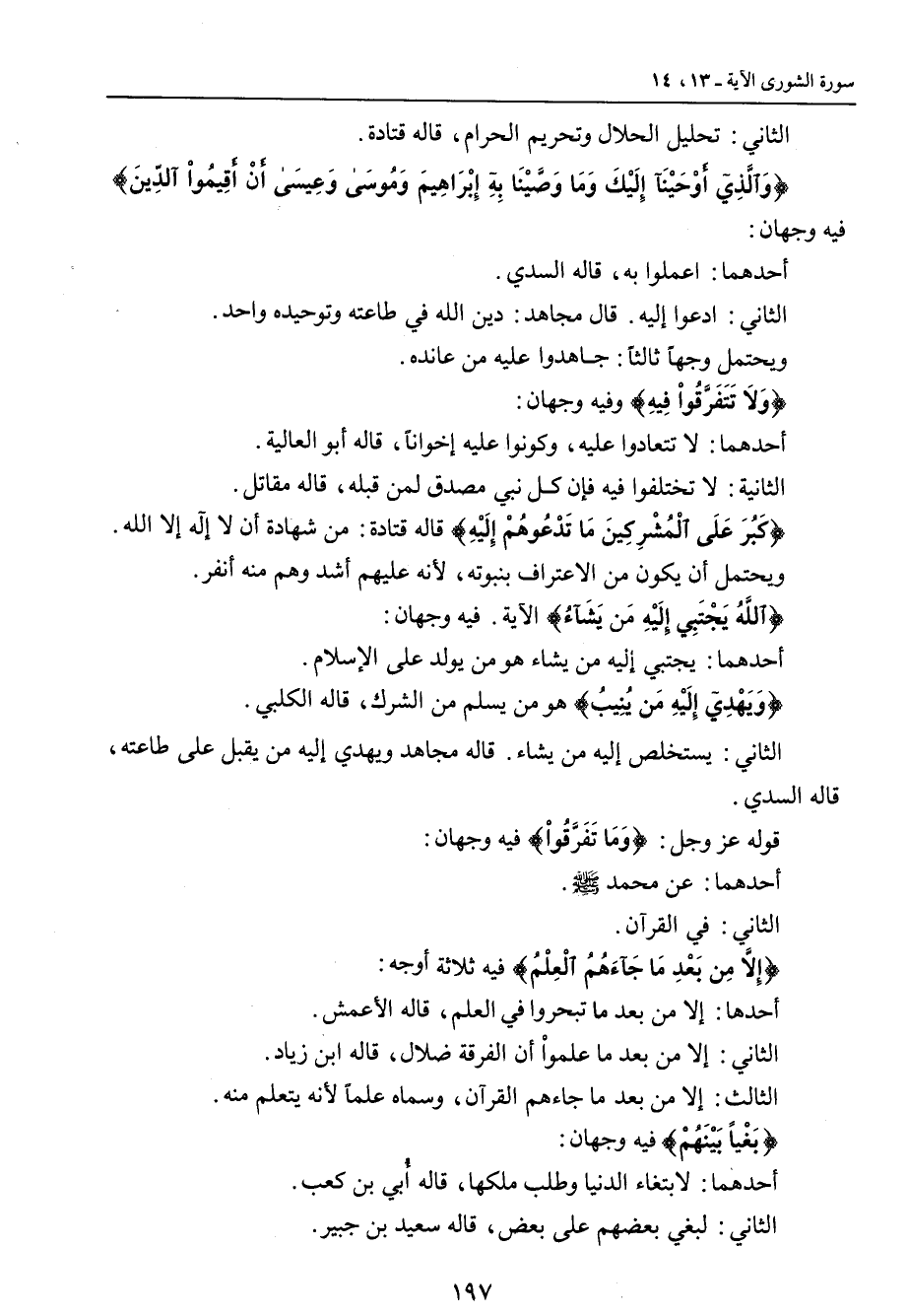 الثاني: تحليل الحلال وتحريم الحرام , قاله قتادة. {وَالَّذِي أَوْحَيْنَآ إِلَيْكَ وَمَا وَصَّيْنَا بِهِ إِبْرَاهِيمَ وَمُوسَى وَعِيسَى أَنْ أَقِيمُواْ الدِّينَ} فيه وجهان: أحدهما: اعملوا به , قاله السدي. الثاني: ادعوا إليه. قال مجاهد: دين الله في طاعته وتوحيده واحد. ويحتمل وجهاً ثالثاً: جاهدوا عليه من عانده. {وَلاَ تَتَفَرَّقُواْ فِيهِ} وفيه وجهان: أحدهما: لا تتعادوا عليه , وكونوا عليه إخواناً , قاله أبو العالية. الثانية: لا تختلفوا فيه فإن كل نبي مصدق لمن قبله , قاله مقاتل. {كَبُرَ عَلَى الْمُشْرِكِينَ مَا تَدْعُوهُمْ إِلَيْهِ} قاله قتادة: من شهادة أن لا إله إلا الله. ويحتمل أن يكون من الاعتراف بنبوته , لأنه عليهم أشد وهم منه أنفر. {اللَّهُ يَجْتَبِي إِلَيْهِ مَن يَشَآءُ} الآية. فيه وجهان: أحدهما: يجتبي إليه من يشاء هو من يولد على الإسلام. {وَيَهْدِي إِلَيْهِ مَن يُنِيبُ} هو من يسلم من الشرك , قاله الكلبي. الثاني: يستخلص إليه من يشاء. قاله مجاهد ويهدي إليه من يقبل على طاعته , قاله السدي. قوله عز وجل: {وَمَا تَفَرَّقُواْ} فيه وجهان: أحدهما: عن محمد صلى الله عليه وسلم. الثاني: في القرآن. {إِلاَّ مِن بَعْدِ مَا جَآءهُمُ الْعِلْمُ} فيه ثلاثة أوجه: أحدها: إلا من بعد ما تبحروا في العلم , قاله الأعمش. الثاني: إلا من بعد ما علمواْ أن الفرقة ضلال , قاله ابن زياد. الثالث: إلا من بعد ما جاءهم القرآن , وسماه علماً لأنه يتعلم منه. {بَغْياً بَيْنَهُمْ} فيه وجهان: أحدهما: لابتغاء الدنيا وطلب ملكها , قاله أُبي بن كعب. الثاني: لبغي بعضهم على بعض , قاله سعيد بن جبير.