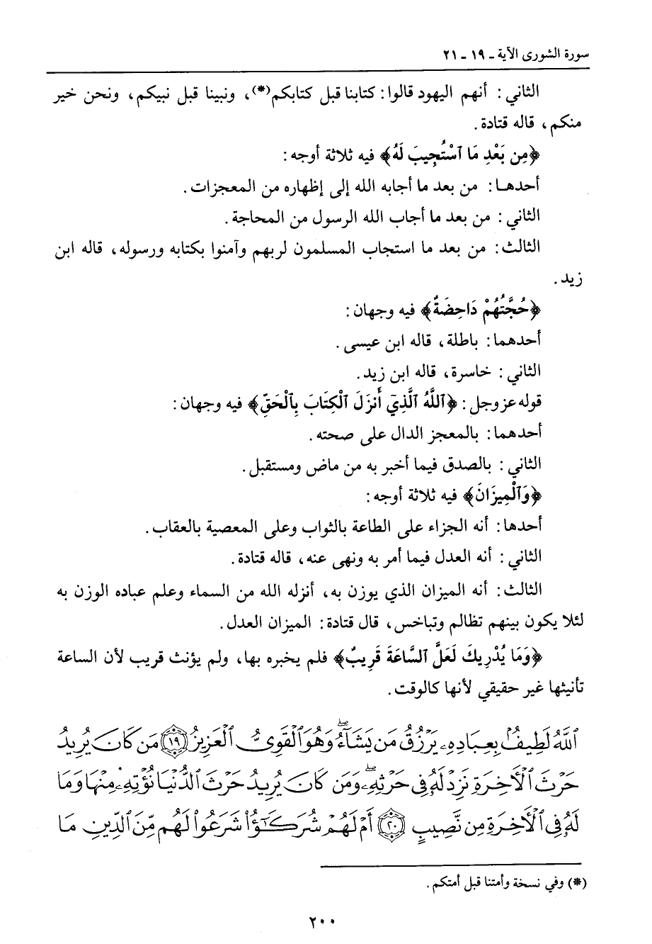 الثاني: أنهم اليهود قالوا: كتابنا قبل كتابكم , ونبينا قبل نبيكم , ونحن خير منكم , قاله قتادة. {مِن بَعْدِ مَا اسْتُجِيبَ لَهُ} فيه ثلاثة أوجه: أحدها: من بعد ما أجابه الله إلى إظهاره من المعجزات. الثاني: من بعد ما أجاب الله الرسول من المحاجة. الثالث: من بعد ما استجاب المسلمون لربهم وآمنوا بكتابه ورسوله , قاله ابن زيد. {حُجَّتُهُمْ دَاحِضَةٌ} فيه وجهان: أحدهما: باطلة , قاله ابن عيسى. الثاني: خاسرة , قاله ابن زيد. قوله عز وجل: {اللَّهُ الَّذِي أَنزَلَ الْكِتَابَ بِالْحَقِّ} فيه وجهان: أحدهما: بالمعجز الدال على صحته. الثاني: بالصدق فيما أخبر به من ماض ومستقبل. {وَالْمِيزَانَ} فيه ثلاثة أوجه: أحدها: أنه الجزاء على الطاعة بالثواب وعلى المعصية بالعقاب. الثاني: أنه العدل فيما أمر به ونهى عنه , قاله قتادة. الثالث: أنه الميزان الذي يوزن به , أنزله الله من السماء وعلم عباده الوزن به لئلا يكون بينهم تظالم وتباخس , قال قتادة: الميزان العدل. {وَمَا يُدْرِيكَ لَعَلَّ السَّاعَةَ قَرِيبٌ} فلم يخبره بها , ولم يؤنث قريب لأن الساعة تأنيثها غير حقيقي لأنها كالوقت.