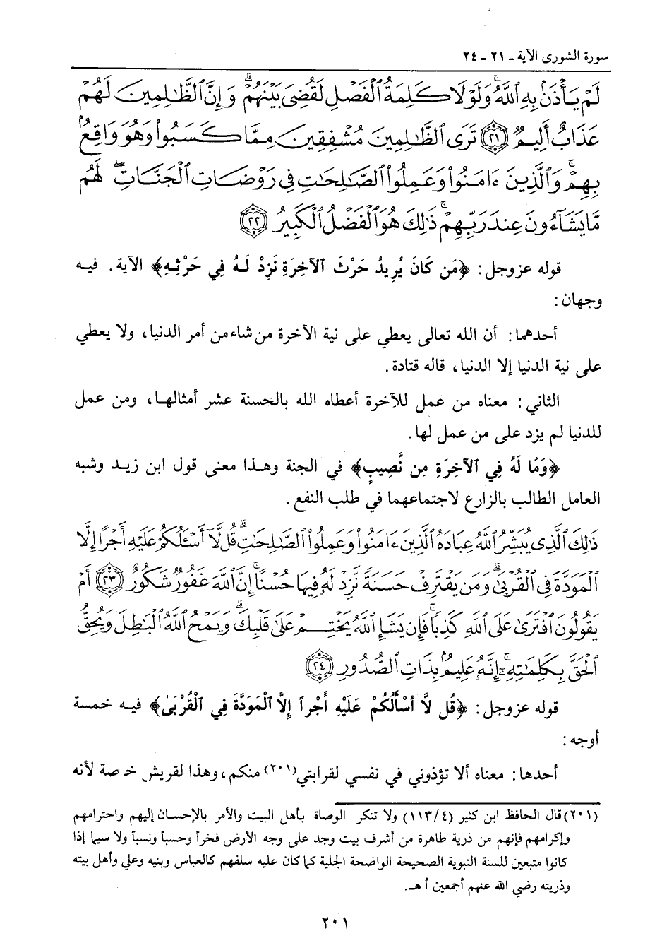 لم يأذن به الله ولولا كلمة الفصل لقضي بينهم وإن الظالمين لهم عذاب أليم ترى الظالمين مشفقين مما كسبوا وهو واقع بهم والذين آمنوا وعملوا الصالحات في روضات الجنات لهم ما يشاؤون عند ربهم ذلك هو الفضل الكبير} قوله عز وجل: {مَن كَانَ يُرِيدُ حَرْثَ الآخِرَةِ نَزِدْ لَهُ فِي حَرْثِهِ} الآية. فيه وجهان: أحدهما: أن الله تعالى يعطي على نية الآخرة من شاء من أمر الدنيا، ولا يعطي على نية الدنيا إلا الدنيا، قاله قتادة. الثاني: معناه من عمل للآخرة أعطاه الله بالحسنة عشر أمثالها، ومن عمل للدنيا لم يزد على من عمل لها. {وَمَا لَهُ فِي الآخِرَةَ مِن نَّصِيبٍ} في الجنة وهذا معنى قول ابن زيد وشبه العامل الطالب بالزارع لاجتماعهما في طلب النفع.
