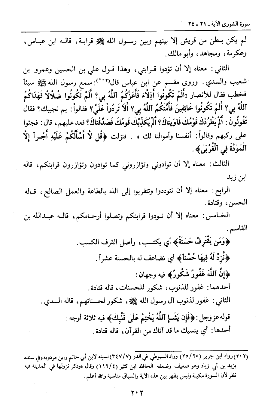 لم يكن بطن من قريش إلا بينهم وبين رسول الله صلى الله عليه وسلم قرابة، قاله ابن عباس، وعكرمة، ومجاهد، وأبو مالك. الثاني: معناه إلا أن تؤدوا قرابتي , وهذا قول علي بن الحسين وعمرو بن شعيب والسدي. وروى مقسم عن ابن عباس قال: سمع رسول الله صلى الله عليه وسلم سيئاً فخطب فقال للأنصار (أَلَمْ تَكُونُواْ أَذِلاَّءَ فَأعِزَّكُمُ اللَّهُ بِي؟ أَلَمْ تَكُونُوا ضُلاَّلاً فَهَداَكُمْ اللَّهُ بِي؟ أَلَمْ تَكُونُوا خأَئِفِينَ فَأَمَّنَكُمُ اللَّهُ بِي؟ أَلاَ تَردُواْ عَلَيَّ) فقالواْ: بم نجيبك؟ فقال تَقُولُونَ: (أَلَمْ يَطْرُدْكَ قَوْمُكَ فَآوَيَنَاكَ؟ أَلَمْ يُكَذِّبْكَ قَومَكَ فَصَدَّقْنَاكَ؟) فعد عليهم , قال: فجثوا على ركبهم وقالواْ: أنفسنا وأموالنا لك (. فنزلت {قُل لاَّ أَسْأَلَكُمْ عَلَيْهِ أَجْراً إِلاَّ الْمَوَدَّةَ فِي الْقُرْبَى}. الثالث: معناه إلا أن توادوني وتؤازروني كما توادون وتؤازرون قرابتكم , قاله ابن زيد. الرابع: معناه إلا أن تتوددوا وتتقربوا إلى الله بالطاعة والعمل الصالح , قاله الحسن , وقتادة. الخامس: معناه إلا أن تودوا قرابتكم وتصلوا أرحامكم , قاله عبد الله بن القاسم. {وَمَن يَقْتَرِفْ حَسَنةً} أي يكتسب , وأصل القرف الكسب. {نَّزِدْ لَهُ فِيهَا حُسْناً} أي نضاعف له بالحسنة عشراً. {إِنَّ اللَّه غَفُورٌ شَكُورٌ} فيه وجهان: أحدهما: غفور للذنوب , شكور للحسنات , قاله قتادة. الثاني: غفور لذنوب آل رسول الله صلى الله عليه وسلم , شكور لحسناتهم , قاله السدي. قوله عز وجل: {فَإِن يَشَإِ اللَّهُ يَخْتِمْ عَلَى قَلْبِكَ} فيه ثلاثة أوجه: أحدها: أي ينسيك ما قد آتاك من القرآن، قاله قتادة.