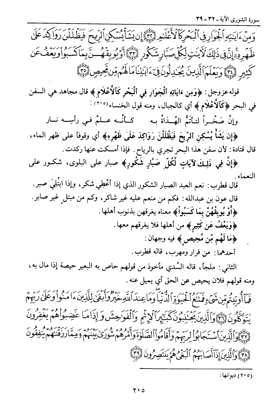 {ومن آياته الجوار في البحر كالأعلام إن يشأ يسكن الريح فيظللن رواكد على ظهره إن في ذلك لآيات لكل صبار شكور أو يوبقهن بما كسبوا ويعف عن كثير ويعلم الذين يجادلون في آياتنا ما لهم من محيص} قوله عز وجل: {وَمِنءَايَاتِهِ الْجَوارِ فِي الْبَحْرِ كَالأَعْلاَمِ} قال مجاهد هي السفن في البحر {كَالأَعْلاَمِ} أي كالجبال , ومنه قول الخنساء: