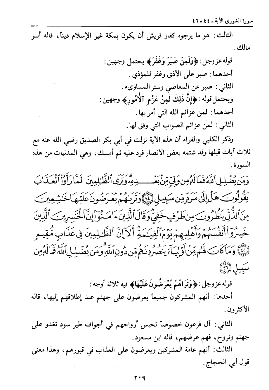 {ومن يضلل الله فما له من ولي من بعده وترى الظالمين لما رأوا العذاب يقولون هل إلى مرد من سبيل وتراهم يعرضون عليها خاشعين من الذل ينظرون من طرف خفي وقال الذين آمنوا إن الخاسرين الذين خسروا أنفسهم وأهليهم يوم القيامة ألا إن الظالمين في عذاب مقيم وما كان لهم من أولياء ينصرونهم من دون الله ومن يضلل الله فما له من سبيل} قوله عز وجل: {وَتَرَاهُمْ يُعْرَضَونَ عَلَيهَا} فيه ثلاثة أوجه: أحدها: أنهم المشركون جميعاً يعرضون على جهنم عند إطلاقهم إليها، قاله الأكثرون. الثاني: آل فرعون خصوصاً تحبس أرواحهم في أجواف طير سود تغدو على جهنم وتروح، فهم عرضهم، قاله ابن مسعود. الثالث: أنهم عامة المشركين ويعرضون على العذاب في قبورهم , وهذا معنى قول أبي الحجاج.