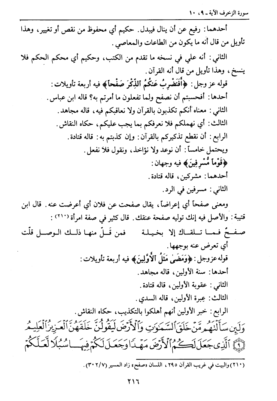 أحدهما: رفيع عن أن ينال فيبدل. حكيم أي محفوظ من نقص أو تغيير، وهذا تأويل من قال أنه ما يكون من الطاعات والمعاصي. الثاني: أنه علي في نسخه ما تقدم من الكتب , وحكيم أي محكم الحكم فلا ينسخ، وهذا تأويل من قال أنه القرآن. قوله عز وجل: {أَفَنَضْرِبُ عَنكُمُ الذِّكْرَ صَفْحاً} فيه أربعة تأويلات: أحدها: أفحسبتم أن نصفح ولما تفعلون ما أمرتم به؟ قاله ابن عباس. الثاني: معناه أنكم تكذبون بالقرآن ولا نعاقبكم فيه , قاله مجاهد. الثالث: أي نهملكم فلا نعرفكم بما يجب عليكم , حكاه النقاش. الرابع: أن نقطع تذكيركم بالقرآن: وإن كذبتم به: قاله قتادة. ويحتمل خامساً: أن نوعد ولا نؤاخذ , ونقول فلا نفعل. {قَوْماً مُّسْرِفِينَ} فيه وجهان: أحدهما: مشركين , قاله قتادة. الثاني: مسرفين في الرد. ومعن صفحاً أي إعراضاً , يقال صفحت عن فلان أي أعرضت عنه. قال ابن قتيبة: والأصل فيه إنك توليه صفحة عنقك. قال كثير في صفة امرأة: