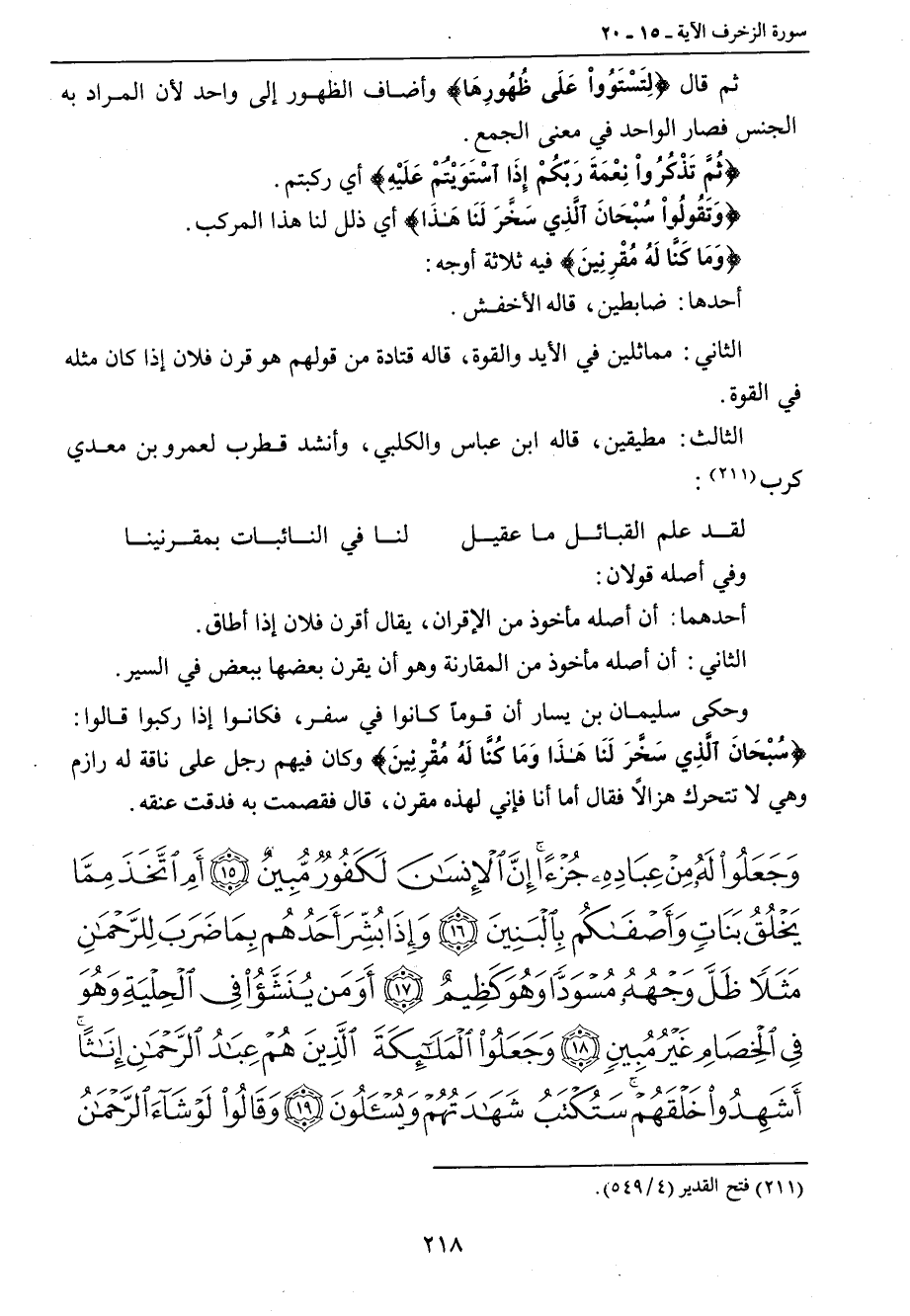 ثم قال {لِتَسْتَوُواْ عَلَى ظُهُورِهَا} وأضاف الظهور إلى واحد لأن المراد به الجنس فصار الواحد في معنى الجمع. {ثُمَّ تَذْكُرُواْ نِعمَةَ رَبِّكُمْ إِذَا اسْتَوَيْتُمْ عَلَيْهِ} أي ركبتم. {وَتَقُولُواْ سُبْحَانَ الَّذِي سَخَّرَ لَنَا هَذَا} أي ذلل لنا هذا المركب. {وَمَا كَنَّا لَهُ مُقْرِنِينَ} فيه ثلاثة أوجه: أحدها: ضابطين , قاله الأخفش. الثاني: مماثلين في الأيد والقوة , قاله قتادة من قولهم هو قرن فلان إذا كان مثله في القوة. الثالث: مطيقين , قاله ابن عباس والكلبي , وأنشد قطرب لعمرو بن معدي كرب.