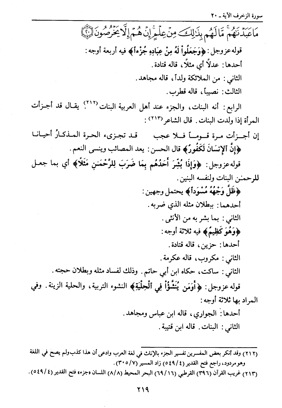 {إِنَّ الإِنسَانَ لَكَفُورٌ} قال الحسن: يعد المصائب وينسى النعم. قوله عز وجل: {وَإِذَا بُشِّرَ أَحَدُهُم بِمَا ضَرَبَ لِلرَّحْمَنِ مَثَلاً} أي بما جعل للرحمن البنات ولنفسه البنين. {ظَلَّ وَجْههُه مُسْوَداً} يحتمل وجهين: أحدهما: ببطلان مثله الذي ضربه. الثاني: بما بشر به من الأنثى. {وَهُوَ كَظِيمٌ} فيه ثلاثة أوجه: أحدها: حزين , قاله قتادة. الثاني: مكروب , قاله عكرمة. الثالث: ساكت , حكاه ابن أبي حاتم. وذلك لفساد مثله وبطلان حجته. قوله عز وجل: {أَوَمَن يُنَشَّؤُاْ فِي الْحِلْيَةِ} النشوء التربية , والحلية الزينة. وفي المراد بها ثلاثة أوجه: أحدها: الجواري , قاله ابن عباس ومجاهد. الثاني: البنات. قاله ابن قتيبة.