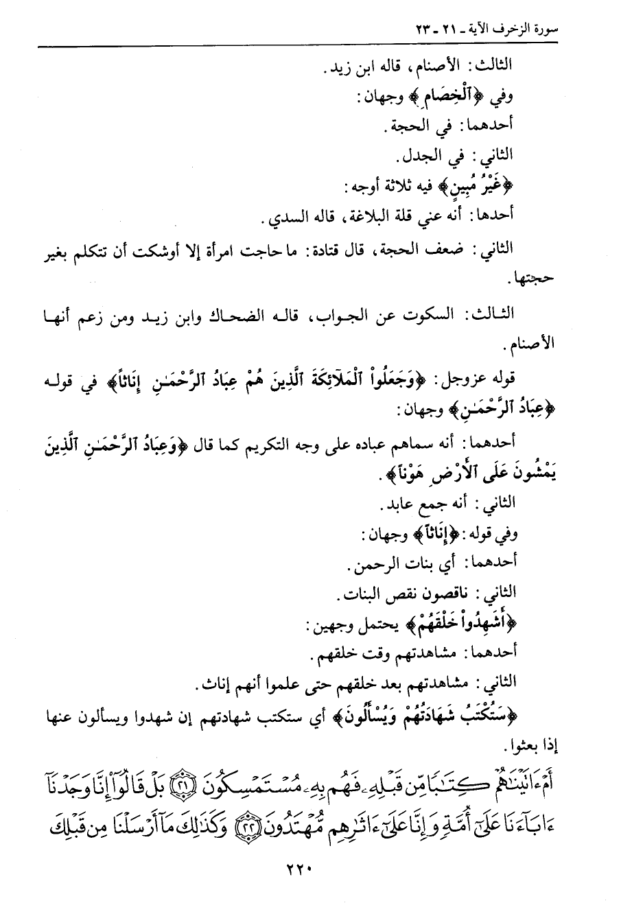 الثالث: الأَصنام , قاله ابن زيد. وفي {الْخِصَامِ} وجهان: أحدهما: في الحجة. الثاني: في الجدل. {غَيْرُ مُبِينٍ} فيه ثلاثة أوجه: أحدها: أنه عني قلة البلاغة , قاله السدي. الثاني: ضعف الحجة , قال قتادة: ما حاجت امرأة إلا أوشكت أن تتكلم بغير حجتها. الثالث: السكوت عن الجواب , قاله الضحاك وابن زيد ومن زعم أنها الأصنام. قوله عز وجل: {وَجَعَلُواْ الْمَلآئِكَةَ الَّذِينَ هُمْ عِبَادُ الرَّحْمنِ إِنَاثاً} في قوله {عِبَادُ الرَّحْمَنِ} وجهان: أحدهما: أنه سماهم عباده على وجه التكريم كما قال {وَعِبَادُ الرَّحْمَنِ الِّذِينَ يَمْشُونَ عَلَى الأَرْضِ هَوْناً}. الثاني: أنه جمع عابد. وفي قوله: {إِنَاثاً} وجهان: أحدهما: أي بنات الرحمن. الثاني: ناقصون نقص البنات. {أَشَهِدُواْ خَلْقَهُمْ} يحتمل وجهين: أحدهما: مشاهدتم وقت خلقهم. الثاني: مشاهدتهم بعد خلقهم حتى علموا أنهم إناث. {سَتُكْتَبُ شَهَادَتُهُمْ وَيُسْأَلُونَ} أي ستكتب شهادتهم إن شهدوا ويسألون عنها إذا بعثوا.