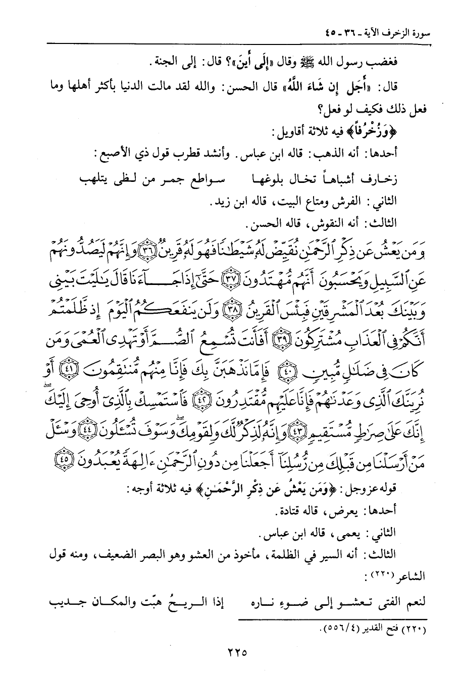 {ومن يعش عن ذكر الرحمن نقيض له شيطانا فهو له قرين وإنهم ليصدونهم عن السبيل ويحسبون أنهم مهتدون حتى إذا جاءنا قال يا ليت بيني وبينك بعد المشرقين فبئس القرين ولن ينفعكم اليوم إذ ظلمتم أنكم في العذاب مشتركون أفأنت تسمع الصم أو تهدي العمي ومن كان في ضلال مبين فإما نذهبن بك فإنا منهم منتقمون أو نرينك الذي وعدناهم فإنا عليهم مقتدرون فاستمسك بالذي أوحي إليك إنك على صراط مستقيم وإنه لذكر لك ولقومك وسوف تسألون واسأل من أرسلنا من قبلك من رسلنا أجعلنا من دون الرحمن آلهة يعبدون} قوله عز وجل: {وَمَن يَعْشُ عَن ذِكْرِ الرَّحْمَنِ} فيه ثلاثة أوجه: أحدها: يعرض، قاله قتادة. الثاني: يعمى، قاله ابن عباس. الثالث: أنه السير في الظلمة , مأخوذ من العشو وهو البصر الضعيف، ومنه قول الشاعر: