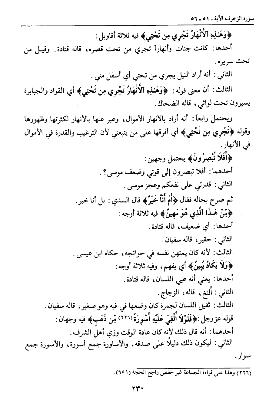 {وَهَذِهِ الأَنْهَارُ تَجْرِي مِن تَحْتِي} فيه ثلاثة أقاويل: أحدها: كانت جنات وأنهاراً تجري من تحت قصره , قاله قتادة. وقيل من تحت سريره. الثاني: أنه أراد النيل يجري من تحتي أي أسفل مني. الثالث: أن معنى قوله: {وَهَذِهِ الأَنْهَارُ تَجْرِي مِن تَحْتِي} أي القواد والجبابرة يسيرون تحت لوائي , قاله الضحاك. ويحتمل رابعاً: أنه أراد بالأنهار الأموال , وعبر عنها بالأنهار لكثرتها وظهورها وقوله {تَجْرِي مِن تَحْتِي} أي أفرقها على من يتبعني لأن الترغيب والقدرة في الأموال في الأنهار. {أَفَلاَ تُبْصِرُونَ} يحتمل وجهين: أحدهما: أفلا تبصرون إلى قوتي وضعف موسى؟. الثاني: قدرتي على نفعكم وعجز موسى. ثم صرح بحاله فقال {أَمْ أَنَاْ خَيْرٌ} قال السدي: بل أنا خير. {مِّنْ هَذَا الَّذِي هُوَ مَهِينٌ} فيه ثلاثة أوجه: أحدها: أي ضعيف , قاله قتادة. الثاني: حقير , قاله سفيان. الثالث: لأنه كان يمتهن نفسه في حوائجه , حكاه ابن عيسى. {وَلاَ يَكَادُ يُبِينُ} أي يفهم , وفيه ثلاثة أوجه: أحدها: يعني أنه عيي اللسان , قاله قتادة. الثاني: أَلثغ قاله , الزجاج. الثالث: ثقيل اللسان لجمرة كان وضعها في فيه وهو صغير , قاله سفيان. قوله عز وجل: {فَلَوْلاَ أُلْقِيَ عَلَيْهِ أَسْوِرَةٌ مِّن ذَهَبٍ} فيه وجهان: أحدهما: أنه قال ذلك لأنه كان عادة الوقت وزي أهل الشرف. الثاني: ليكون ذلك دليلاً على صدقه , والأساورة جمع أسورة , والأسورة جمع سوار.