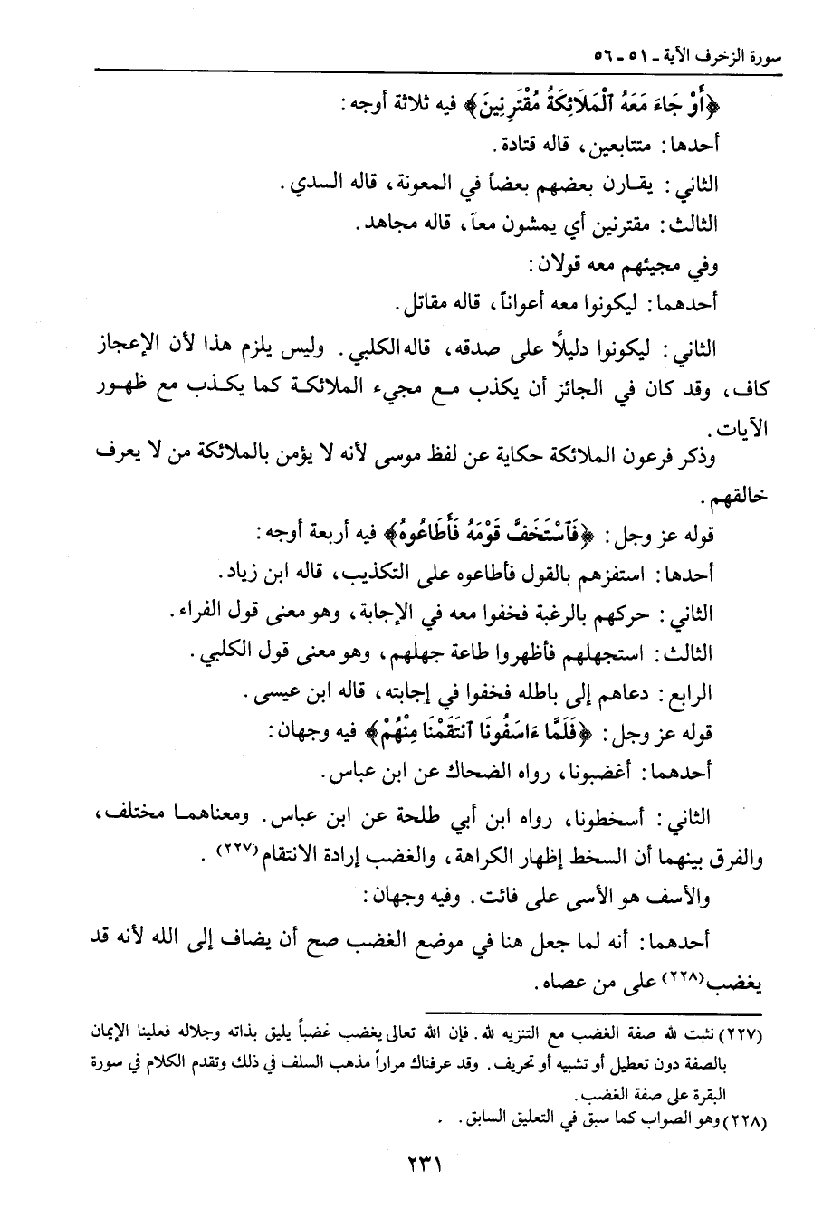 {أَوْ جَاءَ مَعَهُ الْمَلاَئِكَةُ مُقْتَرِنِينَ} فيه ثلاثة أوجه: أحدها: متتابعين، قاله قتادة. الثاني: يقارن بعضهم بعضاً في المعونة , قاله السدي. الثالث: مقترنين أي يمشون معاً , قاله مجاهد. وفي مجيئهم معه قولان: أحدهما: ليكونوا معه أعواناً , قاله مقاتل. الثاني: ليكونوا دليلاً على صدقه , قاله الكلبي. وليس يلزم هذا لأن الإعجاز كاف , وقد كان في الجائز أن يكذب مع مجيء الملائكة كما يكذب مع ظهور الآيات. وذكر فرعون الملائكة حكاية عن لفظ موسى لأنه لا يؤمن بالملائكة من لا يعرف خالقهم. قوله عز وجل: {فَاسْتَخَفَّ قَوْمَهُ فَأَطَاعُوهُ} فيه أربعة أوجه: أحدها: استفزهم بالقول فأطاعوه على التكذيب، قاله ابن زياد. الثاني: حركهم بالرغبة فخفوا معه في الإجابة، وهو معنى قول الفراء. الثالث: استجهلهم فأظهروا طاعة جهلهم، وهو معنى قول الكلبي. الرابع: دعاهم إلى باطله فخفوا في إجابته , قاله ابن عيسى. قوله عز وجل: {فَلَمَّاءَاسَفُونَا انتَقَمْنَا مِنْهُمْ} فيه وجهان: أحدهما: أغضبونا، رواه الضحاك عن ابن عباس. الثاني: أسخطونا، رواه ابن أبي طلحة عن ابن عباس. ومعناهما مختلف، والفرق بينهما أن السخط إظهار الكراهة، والغضب إرادة الانتقام. والأسف هو الأسى على فائت. وفيه وجهان: أحدهما: أنه لما جعل هنا في موضع الغضب صح أن يضاف إلى الله لأنه قد يغضب على من عصاه.