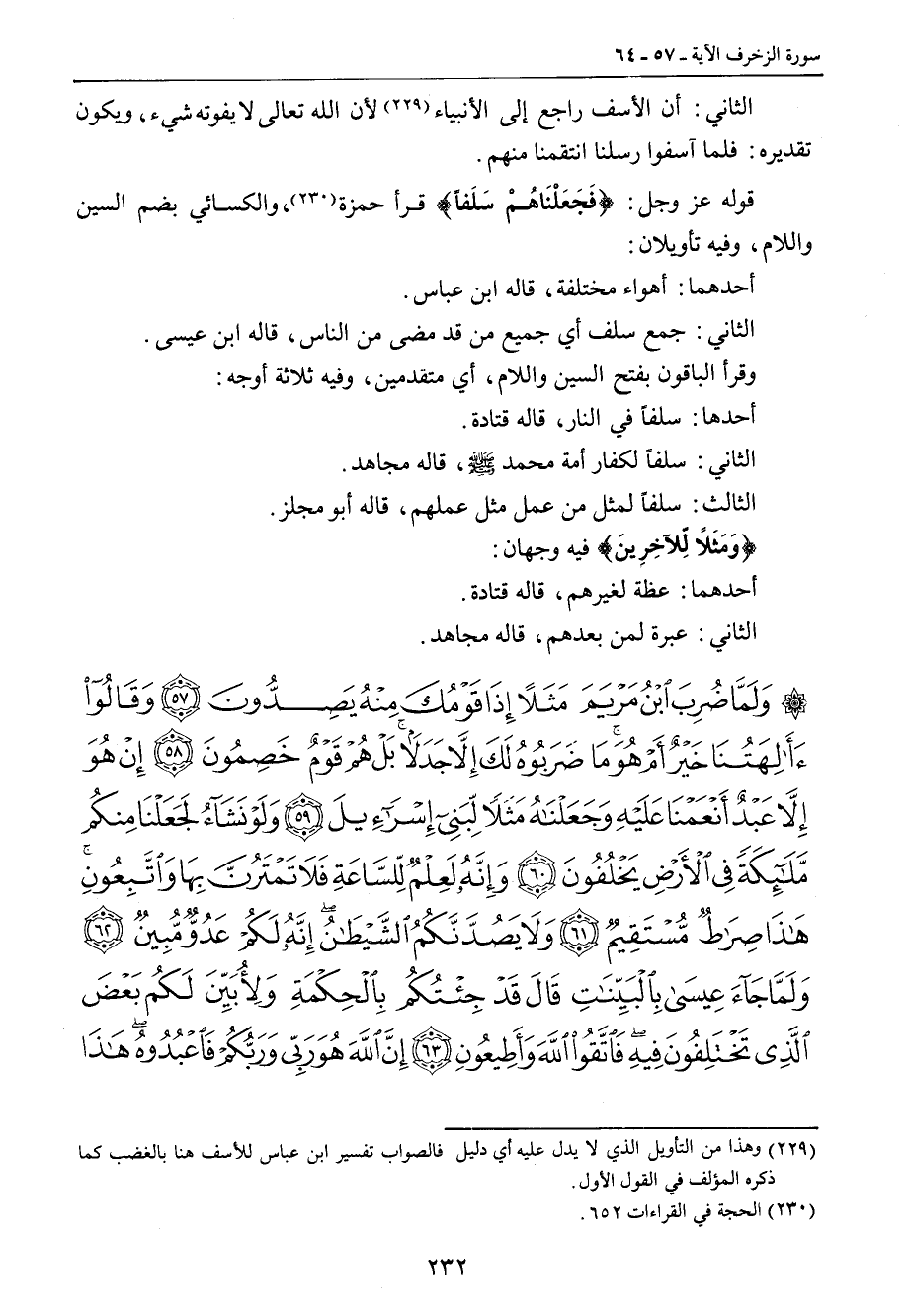 الثاني: أن الأسف راجع إلى الأنبياء لأن الله تعالى لا يفوته شيء , ويكون تقديره: فلما آسفوا رسلنا انتقمنا منهم. قوله عز وجل: {فَجَعَلْنَاهُمْ سَلَفاً} قرأ حمزة والكسائي بضم السين واللام , وفيه تأويلان: أحدهما: أهواء مختلفة , قاله ابن عباس. الثاني: جمع سلف أي جميع من قد مضى من الناس , قاله ابن عيسى. وقرأ الباقون بفتح السين واللام , أي متقدمين , وفيه ثلاثة أوجه: أحدها , سلفاً في النار , قاله قتادة. الثاني: سلفاً لكفار أمة محمد صلى الله عليه وسلم , قاله مجاهد. الثالث: سلفاً لمثل من عمل مثل عملهم , قاله أبو مجلز. {وَمَثَلاً لِّلآخِرينَ} فيه وجهان: أحدهما: عظة لغيرهم , قاله قتادة. الثاني: عبرة لمن بعدهم , قاله مجاهد.