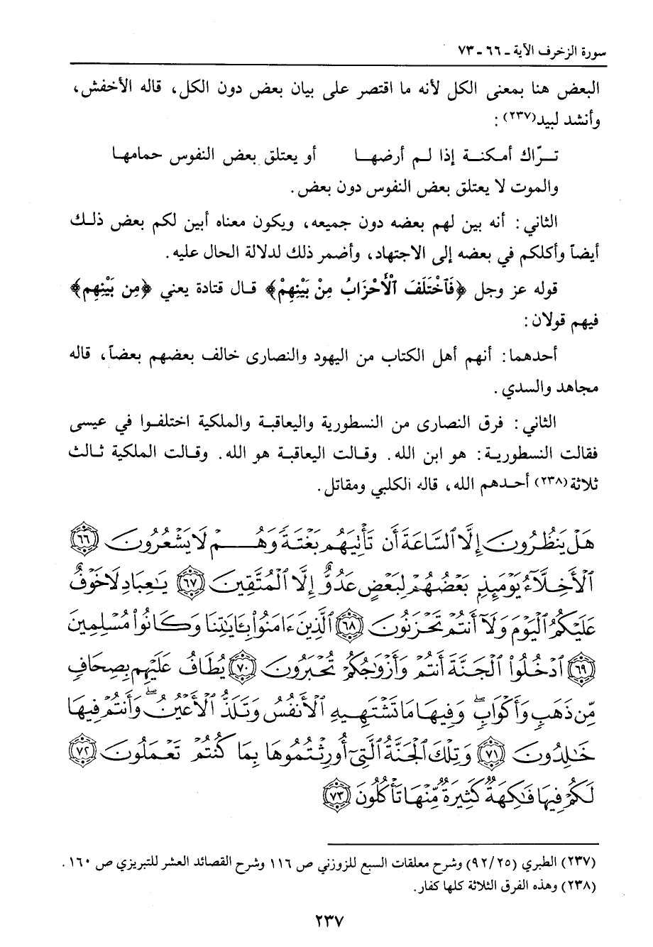 {هل ينظرون إلا الساعة أن تأتيهم بغتة وهم لا يشعرون الأخلاء يومئذ بعضهم لبعض عدو إلا المتقين يا عباد لا خوف عليكم اليوم ولا أنتم تحزنون الذين آمنوا بآياتنا وكانوا مسلمين ادخلوا الجنة أنتم وأزواجكم تحبرون يطاف عليهم بصحاف من ذهب وأكواب وفيها ما تشتهيه الأنفس وتلذ الأعين وأنتم فيها خالدون وتلك الجنة التي أورثتموها بما كنتم تعملون لكم فيها فاكهة كثيرة منها تأكلون}