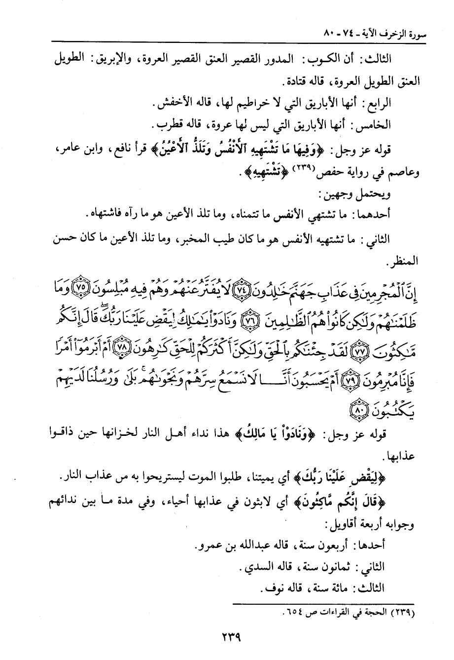 الثالث: أن الكوب: المدور القصير العنق القصير العروة، والإبريق: الطويل العنق الطويل العروة، قاله قتادة. الرابع: أنها الأباريق التي لا خراطيم لها، قاله الأخفش. الخامس: أنها الأباريق التي ليس لها عروة، قاله قطرب. قوله عز وجل: {وَفِيهَا مَا تَشْتَهِيهِ الأَنْفُسُ وَتَلَذُ الأَعْيُنُ} قرأ نافع، وابن عامر، وعاصم في رواية حفص {تَشْتَهِيهِ}. ويحتمل وجهين: أحدهما: ما تشتهي الأنفس ما تتمناه , وما تلذ الأعين هو ما رآه فاشتهاه. الثاني: ما تشتهيه الأنفس هو ما كان طيب المخبر , وما تلذ الأعين ما كان حسن المنظر.