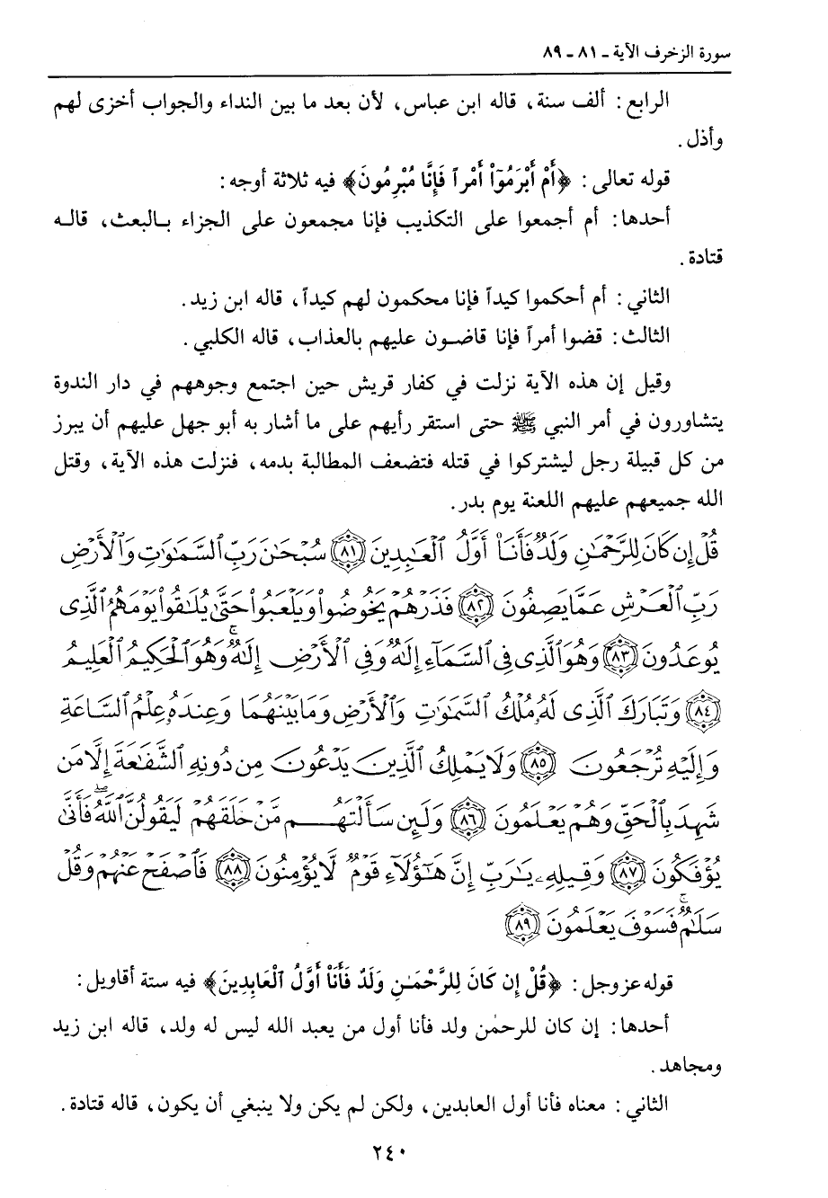 {قل إن كان للرحمن ولد فأنا أول العابدين سبحان رب السماوات والأرض رب العرش عما يصفون فذرهم يخوضوا ويلعبوا حتى يلاقوا يومهم الذي يوعدون وهو الذي في السماء إله وفي الأرض إله وهو الحكيم العليم وتبارك الذي له ملك السماوات والأرض وما بينهما وعنده علم الساعة وإليه ترجعون ولا يملك الذين يدعون من دونه الشفاعة إلا من شهد بالحق وهم يعلمون ولئن سألتهم من خلقهم ليقولن الله فأنى يؤفكون وقيله يا رب إن هؤلاء قوم لا يؤمنون فاصفح عنهم وقل سلام فسوف يعلمون} قوله عز وجل: {قُلْ إِن كَانَ لِلرَّحْمَنِ وَلَدٌ فَأَنَاْ أَوَّلُ الْعَابِدِينَ} فيه ستة أقاويل: أحدها: إن كان للرحمن ولد فأنا أول من يعبد الله ليس له ولد، قاله ابن زيد. ومجاهد. الثاني: معناه فأنا أول العابدين , ولكن لم يكن ولا ينبغي أن يكون، قاله قتادة.