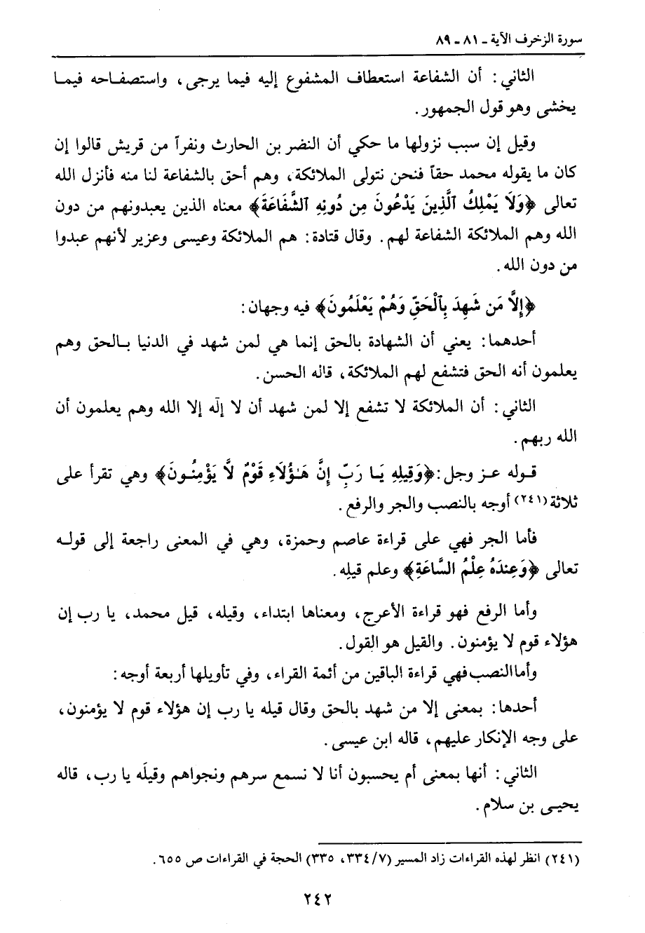 الثاني: أن الشفاعة استعطاف المشفوع إليه فيما يرجى , واستصفاحه فيما يخشى وهو قول الجمهور. وقيل إن سبب نزولها ما حكي أن النضر بن الحارث ونفراً من قريش قالوا إن كان ما يقوله محمد حقاً فنحن نتولى الملائكة , وهم أحق بالشفاعة لنا منه فأنزل الله تعالى {وَلاَ يَمْلِكُ الِّذِينَ يَدْعُونَ مِن دُونِهِ الشَّفَاعَةَ} معناه الذين يعبدونهم من دون الله وهم الملائكة الشفاعة لهم. وقال قتادة: هم الملائكة وعيسى وعزير لأنهم عبدوا من دون الله. {إِلاَّ مَن شَهِدَ بِالْحَقِّ وَهُمْ يَعْلَمُونَ} فيه وجهان: أحدهما: يعني أن الشهادة بالحق إنما هي لمن شهد في الدنيا بالحق وهم يعلمون أنه الحق فتشفع لهم الملائكة , قاله الحسن. الثاني: أن الملائكة لا تشفع إلا لمن شهد أن لا إله إلا الله وهم يعلمون أن الله ربهم. قوله عز وجل: {وَقِيلِهِ يَا رَبِّ إِنَّ هَؤُلاَءِ قَوْمٌ لاَّ يَؤْمِنُونَ} وهي تقرأ على ثلاثة أوجه بالنصب والجر والرفع. فأما الجر فهي على قراءة عاصم وحمزة , وهي في المعنى راجعة إلى قوله تعالى {وَعِندَهُ عِلْمُ السَّاعَةِ} وعلم قيلِه. وأما الرفع فهو قراءة الأعرج , ومعناها ابتداء , وقيله , قيل محمد , يا رب إن هؤلاء قوم لا يؤمنون. والقيل هو القول. وأما النصب فهي قراءة الباقين من أئمة القراء , وفي تأويلها أربعة أوجه: أحدها: بمعنى إلا من شهد بالحق وقال قيله يا رب إن هؤلاء قوم لا يؤمنون، على وجه الإنكار عليهم، قاله ابن عيسى. الثاني: أنها بمعنى أم يحسبون أنا لا نسمع سرهم ونجواهم وقيلَه يا رب، قاله يحيى بن سلام.