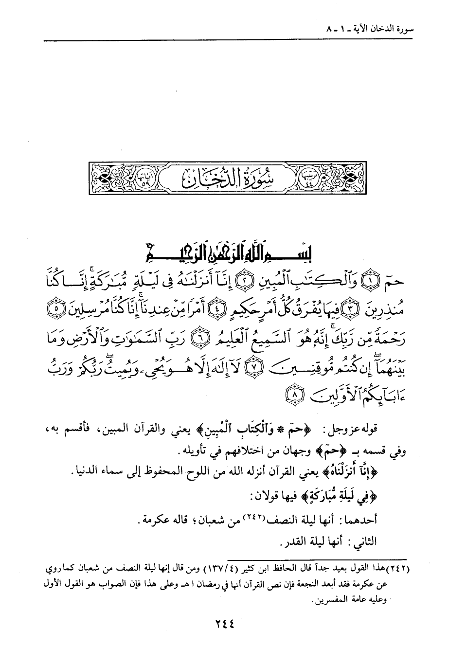 {حم والكتاب المبين إنا أنزلناه في ليلة مباركة إنا كنا منذرين فيها يفرق كل أمر حكيم أمرا من عندنا إنا كنا مرسلين رحمة من ربك إنه هو السميع العليم رب السماوات والأرض وما بينهما إن كنتم موقنين لا إله إلا هو يحيي ويميت ربكم ورب آبائكم الأولين} قوله عز وجل: {حم وَالْكِتَابِ الْمُبِينِ} يعني والقرآن المبين، فأقسم به، وفي قسمه ب {حم} وجهان من اختلافهم في تأويله. {إِنَّآ أَنزَلْنَاهُ} يعني القرآن أنزله الله من اللوح المحفوظ إلى سماء الدنيا. {فِي لَيلَةِ مُّبَارَكَةٍ} فيها قولان: أحدهما: أنها ليلة النصف من شعبان؛ قاله عكرمة. الثاني: أنها ليلة القدر.