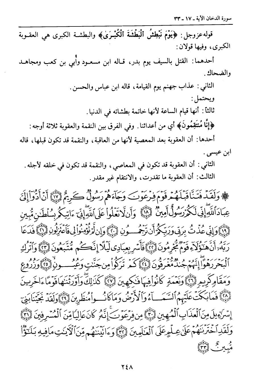 {ولقد فتنا قبلهم قوم فرعون وجاءهم رسول كريم أن أدوا إلي عباد الله إني لكم رسول أمين وأن لا تعلوا على الله إني آتيكم بسلطان مبين وإني عذت بربي وربكم أن ترجمون وإن لم تؤمنوا لي فاعتزلون فدعا ربه أن هؤلاء قوم مجرمون فأسر بعبادي ليلا إنكم متبعون واترك البحر رهوا إنهم جند مغرقون كم تركوا من جنات وعيون وزروع ومقام كريم ونعمة كانوا فيها فاكهين كذلك وأورثناها قوما آخرين فما بكت عليهم السماء والأرض وما كانوا منظرين ولقد نجينا بني إسرائيل من العذاب المهين من فرعون إنه كان عاليا من المسرفين ولقد اخترناهم على علم على العالمين وآتيناهم من الآيات ما فيه بلاء مبين}