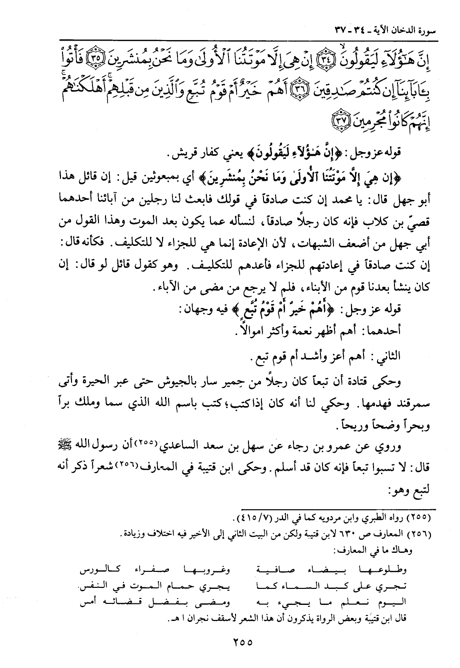 {إن هؤلاء ليقولون إن هي إلا موتتنا الأولى وما نحن بمنشرين فأتوا بآبائنا إن كنتم صادقين أهم خير أم قوم تبع والذين من قبلهم أهلكناهم إنهم كانوا مجرمين} قوله عز وجل: {إِنَّ هَؤُلآءِ لَيَقُولُونَ} يعني كفار قريش. {إن هِيَ إِلاَّ مَوْتَتُنَا الأُولَى وَمَا نَحْنُ بِمُنشَرِينَ} أي بمبعوثين قيل: إن قائل هذا أبو جهل قال: يا محمد إن كنت صادقاً في قولك فابعث لنا رجلين من آبائنا أحدهما قصيّ بن كلاب فإنه كان رجلاً صادقاً , لنسأله عما يكون بعد الموت وهذا القول من أبي جهل من أضعف الشبهات , لأن الإعادة إنما هي للجزاء لا للتكليف. فكأنه قال: إن كنت صادقاً في إعادتهم للجزاء فأعدهم للتكليف. وهو كقول قائل لو قال: إن كان ينشأ بعدنا قوم من الأبناء , فلم لا يرجع من مضى من الآباء. قوله عز وجل: {أَهُمْ خَيرٌ أَمْ قَوْمُ تُبَّعٍ} فيه وجهان: أحدهما: أهم أظهر نعمة وأكثر أموالاً. الثاني: أهم أعز وأشد أم قوم تبع. وحكى قتادة أن تبعاً كان رجلاً من حِمير سار بالجيوش حتى عبر الحيرة وأتى سمرقند فهدمها. وحكي لنا أنه كان إذا كتب؛ كتب باسم الله الذي سما وملك براً وبحراً وضحاً وريحاً. وروي عن عمرو بن رجاء عن سهل بن سعد الساعدي أن رسول الله صلى الله عليه وسلم قال: لا تسبوا تبعاً فإنه كان قد أسلم. وحكى ابن قتيبة في المعارف شعراً ذكر أنه لتبع وهو:
