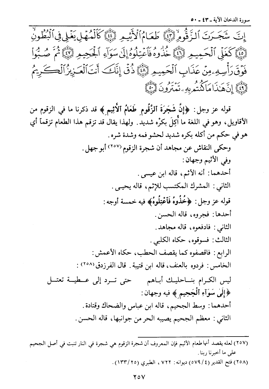 {إن شجرة الزقوم طعام الأثيم كالمهل يغلي في البطون كغلي الحميم خذوه فاعتلوه إلى سواء الجحيم ثم صبوا فوق رأسه من عذاب الحميم ذق إنك أنت العزيز الكريم إن هذا ما كنتم به تمترون} قوله عز وجل: {إِنَّ شَجَرَةَ الزَّقُومِ طَعَامُ الأَثِيمِ} قد ذكرنا ما في الزقوم من الأَقاويل , وهو في اللغة ما أُكِلَ بكرْه شديد. ولهذا يقال قد تزقم هذا الطعام تزقماً أي هو في حكم من أكله بكره شديد لحشو فمه وشدة شره. وحكى النقاش عن مجاهد أن شجرة الزقوم أبو جهل. وفي الأثيم وجهان: أحدهما: أنه الآثم، قاله ابن عيسى. الثاني: المشرك المكتسب للإثم، قاله يحيى. قوله عز وجل: {خُذُوهُ فَاعْتِلُوهُ} فيه خمسة أوجه: أحدها: فجروه، قاله الحسن. الثاني: فادفعوه , قاله مجاهد. الثالث: فسوقوه , حكاه الكلبي. الرابع: فاقصفوه كما يقصف الحطب , حكاه الأعمش: الخامس: فردوه بالعنف , قاله ابن قتيبة. قال الفرزدق: