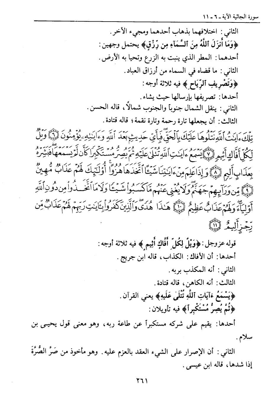 {تلك آيات الله نتلوها عليك بالحق فبأي حديث بعد الله وآياته يؤمنون ويل لكل أفاك أثيم يسمع آيات الله تتلى عليه ثم يصر مستكبرا كأن لم يسمعها فبشره بعذاب أليم وإذا علم من آياتنا شيئا اتخذها هزوا أولئك لهم عذاب مهين من ورائهم جهنم ولا يغني عنهم ما كسبوا شيئا ولا ما اتخذوا من دون الله أولياء ولهم عذاب عظيم هذا هدى والذين كفروا بآيات ربهم لهم عذاب من رجز أليم} قوله عز وجل: {وَيْلٌ لِكُلِّ أَفَّاكٍ أَثِيمٍ} فيه ثلاثة أوجه: أحدها: أن الأفاك: الكذاب , قاله ابن جريج. الثاني: أنه المكذب بربه. الثالث: أنه الكاهن , قاله قتادة. {يَسْمَعُءَآيَاتِ اللَّهِ تُتْلَى عَلَيهِ} يعني القرآن. {ثُمَّ يُصِرُّ مُسْتَكْبِراً} فيه تأويلان: أحدها: يقيم على شركه مستكبراً عن طاعة ربه، وهو معنى قول يحيى بن سلام. الثاني: أن الإصرار على الشيء العقد بالعزم عليه، وهو مأخوذ من صَرَّ الصُّرَّةَ إذا شدها، قاله ابن عيسى.