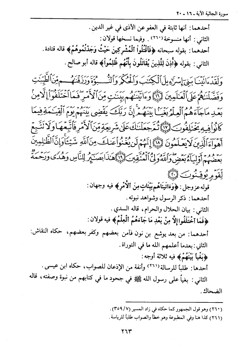 {ولقد آتينا بني إسرائيل الكتاب والحكم والنبوة ورزقناهم من الطيبات وفضلناهم على العالمين وآتيناهم بينات من الأمر فما اختلفوا إلا من بعد ما جاءهم العلم بغيا بينهم إن ربك يقضي بينهم يوم القيامة فيما كانوا فيه يختلفون ثم جعلناك على شريعة من الأمر فاتبعها ولا تتبع أهواء الذين لا يعلمون إنهم لن يغنوا عنك من الله شيئا وإن الظالمين بعضهم أولياء بعض والله ولي المتقين هذا بصائر للناس وهدى ورحمة لقوم يوقنون} قوله عز وجل: {وَءَاتَينَاهُم بَيِّنَاتٍ مِنَ الأَمْرِ} فيه وجهان: أحدهما: ذكر الرسول وشواهد نبوته. الثاني: بيان الحلال والحرام , قاله السدي. {فَمَا اخْتَلَفُوا إِلاَّ مِنْ بَعْدِ مَا جَآءَهُمُ الْعِلْمُ} فيه قولان: أحدهما: من بعد يوشع بن نون فآمن بعضهم وكفر بعضهم , حكاه النقاش. الثاني: بعدما أعلمهم الله ما في التوراة. {بَغْياً بَيْنَهُمْ} فيه ثلاثة أوجه: أحدها: طلباً للرسالة وأنفة من الإذعان للصواب , حكاه ابن عيسى. الثاني: بغياً على رسول الله صلى عليه وسلم في جحود ما في كتابهم من نبوة وصفته، قاله الضحاك.