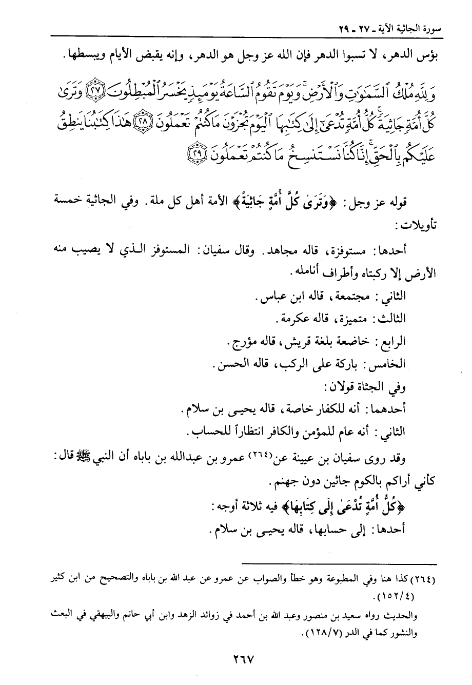 {ولله ملك السماوات والأرض ويوم تقوم الساعة يومئذ يخسر المبطلون وترى كل أمة جاثية كل أمة تدعى إلى كتابها اليوم تجزون ما كنتم تعملون هذا كتابنا ينطق عليكم بالحق إنا كنا نستنسخ ما كنتم تعملون} قوله عز وجل: {وَتَرَى كُلَّ أُمَّةٍ جَاثِيَةً} الأمة أهل كل ملة. وفي الجاثية خمسة تأويلات: أحدها: مستوفزة , قاله مجاهد. وقال سفيان: المستوفز الذي لا يصيب منه الأرض إلا ركبتاه وأطراف أنامله. الثاني: مجتمعة , قاله ابن عباس. الثالث: متميزة , قاله عكرمة. الرابع: خاضعة بلغة قريش , قاله مؤرج. الخامس: باركة على الركب , قاله الحسن. وفي الجثاة قولان: أحدهما: أنه للكفار خاصة , قاله يحيى بن سلام. الثاني: أنه عام للمؤمن والكافر انتظاراً للحساب. وقد روى سفيان بن عيينة عن عمرو بن عبد الله بن باباه أن النبي صلى الله عليه وسلم قال: كأني أراكم بالكوم جاثين دون جهنم. {كُلُّ أُمَّةٍ تُدْعَى إِلَى كِتَابِهَا} فيه ثلاثة أوجه: أحدها: إلى حسابها، قاله يحيى بن سلام.