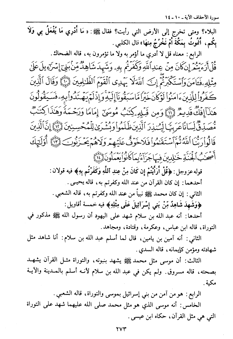 {قل أرأيتم إن كان من عند الله وكفرتم به وشهد شاهد من بني إسرائيل على مثله فآمن واستكبرتم إن الله لا يهدي القوم الظالمين وقال الذين كفروا للذين آمنوا لو كان خيرا ما سبقونا إليه وإذ لم يهتدوا به فسيقولون هذا إفك قديم ومن قبله كتاب موسى إماما ورحمة وهذا كتاب مصدق لسانا عربيا لينذر الذين ظلموا وبشرى للمحسنين إن الذين قالوا ربنا الله ثم استقاموا فلا خوف عليهم ولا هم يحزنون أولئك أصحاب الجنة خالدين فيها جزاء بما كانوا يعملون} قوله عز وجل: {قُلْ أَرَأَيْتُمْ إِن كَانَ مِنْ عِندِ اللَّهِ وَكَفَرْتُم بِهِ} فيه قولان: أحدهما: إن كان القرآن من عند الله وكفرتم به , قاله يحيى. الثاني: إن كان محمد صلى الله عليه وسلم نبياً من عند الله وكفرتم به , قاله الشعبي. {وَشَهِدَ شَاهِدٌ مِّنْ بَني إِسْرَآئِيلَ عَلَى مِثْلِهِ} فيه خمسة أقاويل: أحدها: أنه عبد الله بن سلام شهد على اليهود أن رسول الله صلى الله عليه وسلم مذكور في التوراة , قاله ابن عباس، وعكرمة، وقتادة، ومجاهد. الثاني: أنه آمين بن يامين، قال لما أسلم عبد الله بن سلام: أنا شاهد مثل شهادته ومؤمن كإيمانه، قاله السدي. الثالث: أن موسى مثل محمد صلى الله عليه وسلم يشهد بنبوته، والتوراة مثل القرآن يشهد بصحته، قاله مسروق. ولم يكن في عبد الله بن سلام لأنه أسلم بالمدينة والآية مكية. الرابع: هو من آمن من بني إسرائيل بموسى والتوراة، قاله الشعبي. الخامس: أنه موسى الذي هو مثل محمد صلى الله عليهما شهد على التوراة. التي هي مثل القرآن، حكاه ابن عيسى.