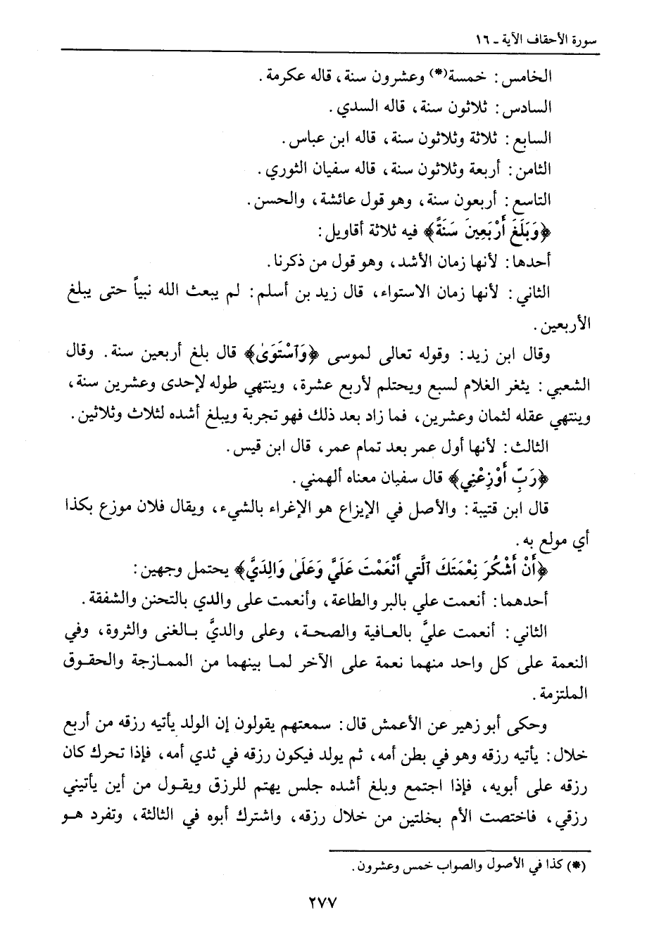 الخامس: خمسة وعشرون سنة , قاله عكرمة. السادس: ثلاثون سنة , قاله السدي. السابع: ثلاثة وثلاثون سنة , قاله ابن عباس. الثامن: أربعة وثلاثون سنة , قاله سفيان الثوري. التاسع: أربعون سنة , وهو قول عائشة , والحسن. {وَبَلَغَ أَرْبَعِينَ سَنَةً} فيه ثلاثة أقاويل: أحدها: لأنها زمان الأشد , وهو قول من ذكرنا. الثاني: لأنها زمان الاستواء , قال زيد بن أسلم: لم يبعث الله نبياً حتى يبلغ الأربعين. وقال ابن زيد: وقوله تعالى لموسى {وَاسْتَوَى} قال بلغ أربعين سنة. وقال الشعبي: يثغر الغلام لسبع ويحتلم لأربع عشرة , وينتهي طوله لإحدى وعشرين سنة , وينتهي عقله لثمان وعشرين , فما زاد بعد ذلك فهو تجربة ويبلغ أشده لثلاث وثلاثين. الثالث: لأنها أول عمر بعد تمام عمر , قال ابن قيس. {رَبِّ أَوْزِعْنِي} قال سفيان معناه ألهمني. قال ابن قتيبة: والأصل في الإيزاع هو الإغراء بالشيء , ويقال فلان موزع بكذا أي مولع به. {أَن أَشْكُر نِعْمَتَكَ الَّتي أَنْعَمْتَ عَلَيَّ وَعَلَى وَالِدَيَّ} يحتمل وجهين: أحدهما: أنعمت علي بالبر والطاعة , وأنعمت على والدي بالتحنن والشفقة. الثاني: أنعمت عليَّ بالعافية والصحة , وعلى والديَّ بالغنى والثروة , وفي النعمة على كل واحد منهما نعمة على الآخر لما بينهما من الممازجة والحقوق الملتزمة. وحكى أبو زهير عن الأعمش قال: سمعتهم يقولون إن الولد يأتيه رزقه من أربع خلال: يأتيه رزقه وهو في بطن أمه , ثم يولد فيكون رزقه في ثدي أمه، فإذا تحرك كان رزقه على أبويه، فإذا اجتمع وبلغ أشده جلس يهتم للرزق ويقول من أين يأتيني رزقي، فاختصت الأم بخلتين من خلال رزقه , واشترك أبوه في الثالثة , وتفرد هو