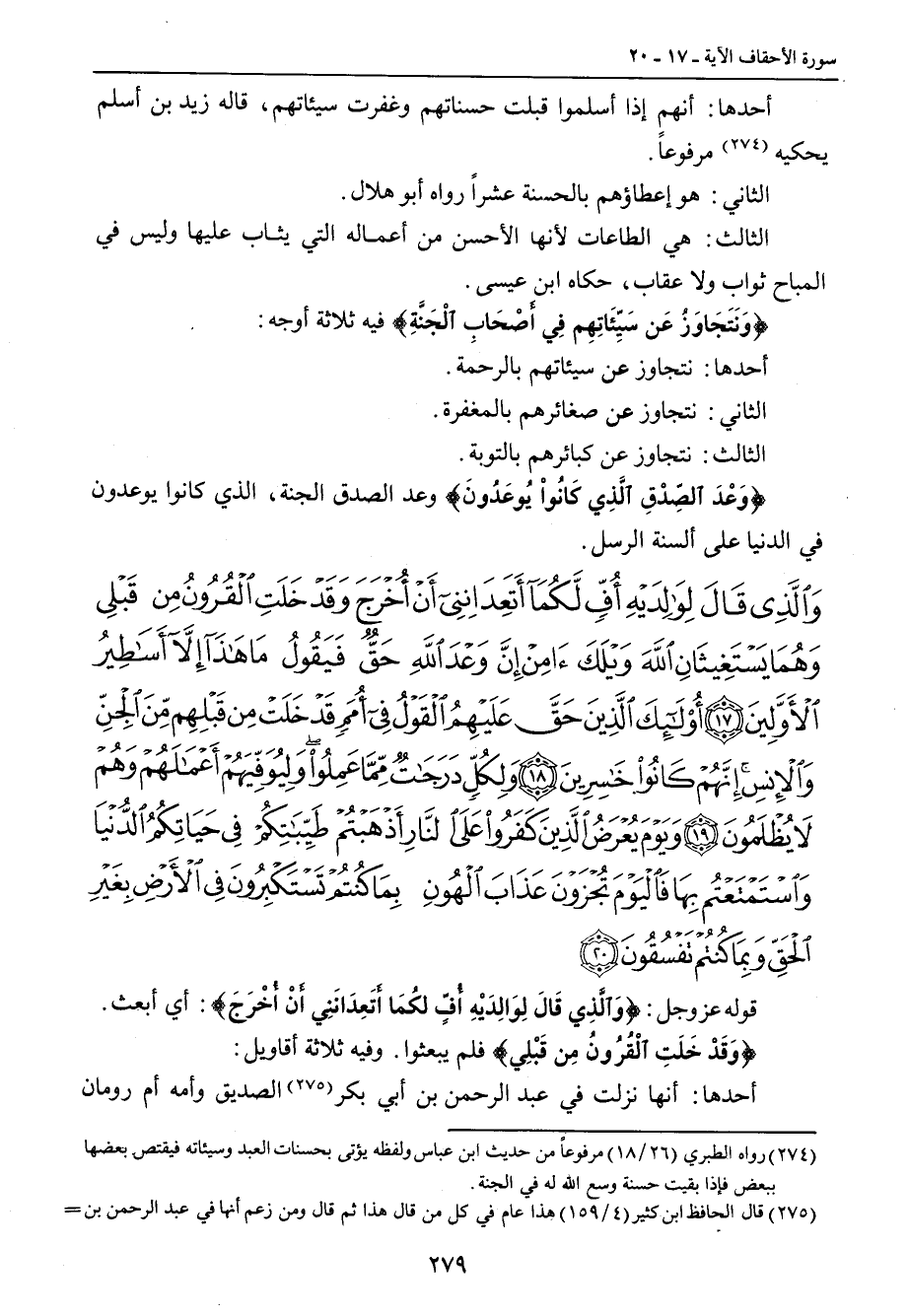 {والذي قال لوالديه أف لكما أتعدانني أن أخرج وقد خلت القرون من قبلي وهما يستغيثان الله ويلك آمن إن وعد الله حق فيقول ما هذا إلا أساطير الأولين أولئك الذين حق عليهم القول في أمم قد خلت من قبلهم من الجن والإنس إنهم كانوا خاسرين ولكل درجات مما عملوا وليوفيهم أعمالهم وهم لا يظلمون ويوم يعرض الذين كفروا على النار أذهبتم طيباتكم في حياتكم الدنيا واستمتعتم بها فاليوم تجزون عذاب الهون بما كنتم تستكبرون في الأرض بغير الحق وبما كنتم تفسقون} قوله عز وجل: {وَالَّذِي قَالَ لِوَالِدَيْهِ أُفٍّ لكُمَا أَتَعِدَانَنِي أَنْ أُخْرَجَ}: أي أبعث. {وَقَدْ خَلَتْ الْقُرُونُ مِن قَبْلِي} فلم يبعثوا. وفيه ثلاثة أقاويل: أحدها: أنها نزلت في عبد الرحمن بن أبي بكر الصديق وأمه أم رومان