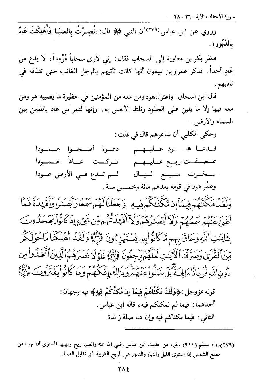 {ولقد مكناهم فيما إن مكناكم فيه وجعلنا لهم سمعا وأبصارا وأفئدة فما أغنى عنهم سمعهم ولا أبصارهم ولا أفئدتهم من شيء إذ كانوا يجحدون بآيات الله وحاق بهم ما كانوا به يستهزؤون ولقد أهلكنا ما حولكم من القرى وصرفنا الآيات لعلهم يرجعون فلولا نصرهم الذين اتخذوا من دون الله قربانا آلهة بل ضلوا عنهم وذلك إفكهم وما كانوا يفترون} قوله عز وجل: {وَلَقَدْ مََّكنَّاهُمْ فِيمَآ إِن مَّكنَّاكُمْ فِيهِ} فيه وجهان: أحدهما: فيما لم نمكنكم فيه , قاله ابن عباس. الثاني: فيما مكناكم فيه وإن هنا صلة زائدة.