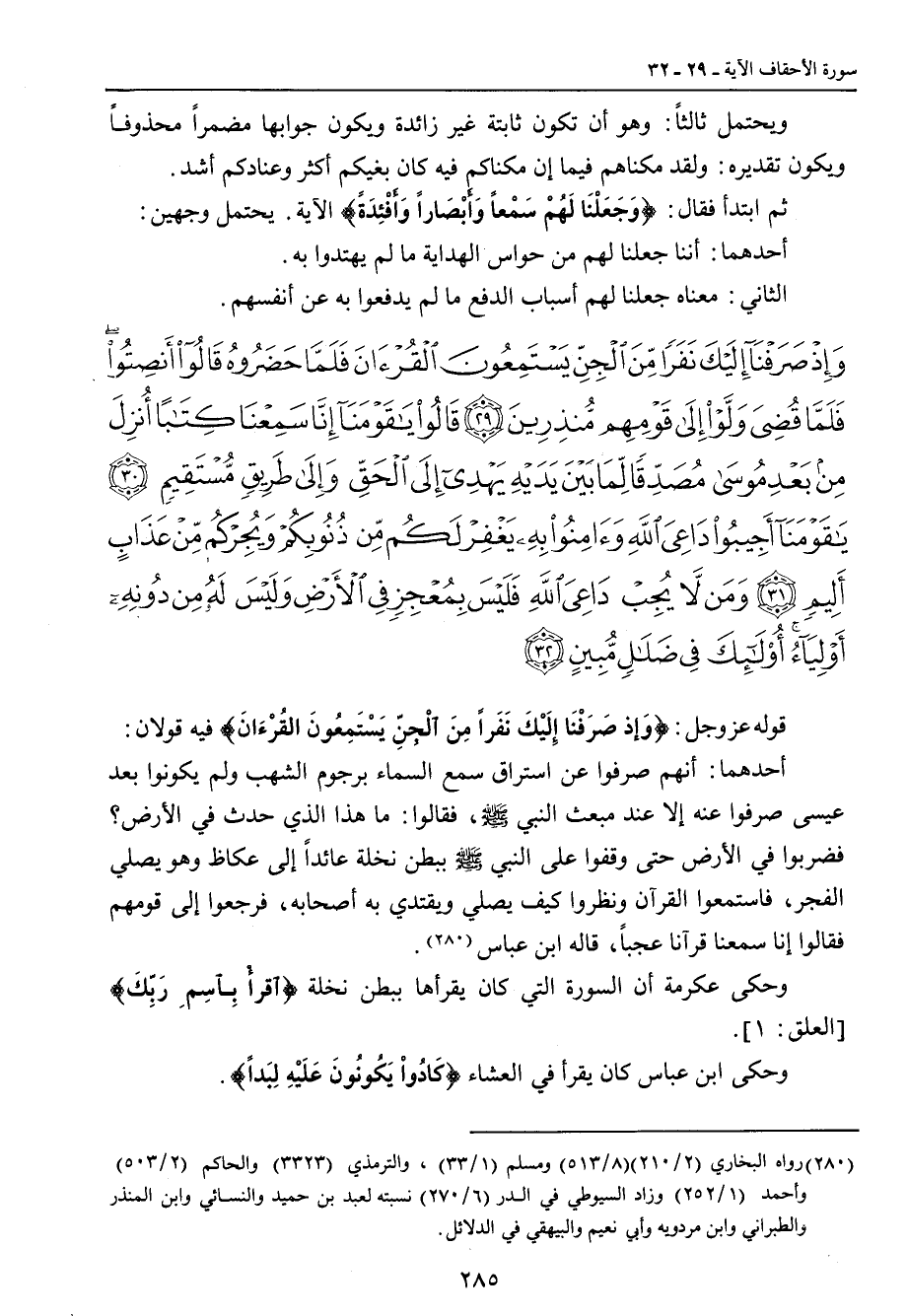 {وإذ صرفنا إليك نفرا من الجن يستمعون القرآن فلما حضروه قالوا أنصتوا فلما قضي ولوا إلى قومهم منذرين قالوا يا قومنا إنا سمعنا كتابا أنزل من بعد موسى مصدقا لما بين يديه يهدي إلى الحق وإلى طريق مستقيم يا قومنا أجيبوا داعي الله وآمنوا به يغفر لكم من ذنوبكم ويجركم من عذاب أليم ومن لا يجب داعي الله فليس بمعجز في الأرض وليس له من دونه أولياء أولئك في ضلال مبين} قوله عز وجل: {وَإذ صَرَفْنَا إِلَيْكَ نَفَراً مِنَ الْجِنِّ يَسْتَمِعُونَ القُرْءانَ} فيه قولان: أحدهما: أنهم صرفوا عن استراق سمع السماء برجوم الشهب ولم يكونوا بعد عيسى صرفوا عنه إلا عند مبعث النبي صلى الله عليه وسلم , فقالوا: ما هذا الذي حدث في الأرض؟ فضربوا في الأَرض حتى وقفوا على النبي صلى الله عليه وسلم ببطن نخلة عائداً إلى عكاظ وهو يصلي الفجر , فاستمعوا القرآن ونظروا كيف يصلي ويقتدي به أصحابه، فرجعوا إلى قومهم فقالوا إنا سمعنا قرآنا عجباً، قاله ابن عباس. وحكى عكرم أن السورة التي كان يقرأها ببطن نخلة {اقرأْ بِاسِمِ رَبِّكَ} [العلق: 1] وحكى ابن عباس كان يقرأ في العشاء {كَادوا يَكُونُونَ عَلَيْهِ لِبَداً}.