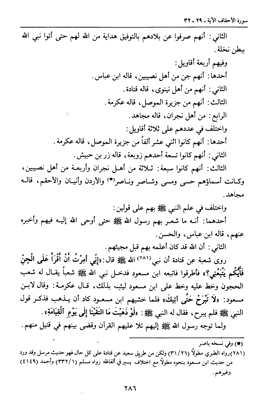 الثاني: أنهم صرفوا عن بلادهم بالتوفيق هداية من الله لهم حتى أتوا نبي الله ببطن نخلة. وفيهم أربعة أقاويل: أحدها: أنهم جن من أهل نصيبين , قاله ابن عباس. الثاني: أنهم من أهل نينوى , قاله قتادة. الثالث: أنهم من جزيرة الموصل , قاله عكرمة. الرابع: من أهل نجران , قاله مجاهد. واختلف في عددهم على ثلاثة أقاويل: أحدها: أنهم كانوا اثني عشر ألفاً من جزيرة الموصل , قاله عكرمة. الثاني: أنهم كانوا تسعة أحدهم زوبعة , قاله زر بن حبيش. الثالث: أنهم كانوا سبعة: ثلاثة من أهل نجران وأربعة من أهل نصيبين , وكانت أسماؤهم حسى ومسى وشاصر وناصر والأردن وأنيان الأحقم , قاله مجاهد. واختلف في علم النبي صلى الله عليه وسلم على قولين: أحدهما: أنه ما شعر بهم رسول الله صلى الله عليه وسلم حتى أوحى الله إليه فيهم وأخبره عنهم , قاله ابن عباس , والحسن. الثاني: أن الله قد كان أعلمه بهم قبل مجيئهم. روى شعبة عن قتادة أن نبي الله صلى الله عليه وسلم قال: (إِنِّي أمِرْتُ أَنْ أَقْرَأَ عَلَى الْجِنِّ فَأَيُّكُمْ يَتْبَعُنِي) فأطرقوا فاتبعه ابن مسعود فدخل نبي الله صلى الله عليه وسلم شعباً يقال له شعب الحجون وخط عليه وخط على ابن مسعود ليثبته بذلك , قال عكرمة: وقال لابن مسعود: (لاَ تَبْرَحْ حَتَّى آتِيكَ) فلما خشيهم ابن مسعود كاد أن يذهب فذكر قول النبي صلى الله عليه وسلم فلم يبرح , فقال له النبي صلى الله عليه وسلم: (لَوْ ذَهَبْتَ مَا التَقَيْنَا إِلَى يَوْمِ الْقِيَامَةِ) ولما توجه رسول الله صلى الله عليه وسلم إليهم تلا عليهم القرآن وقضى بينهم في قتيل منهم.