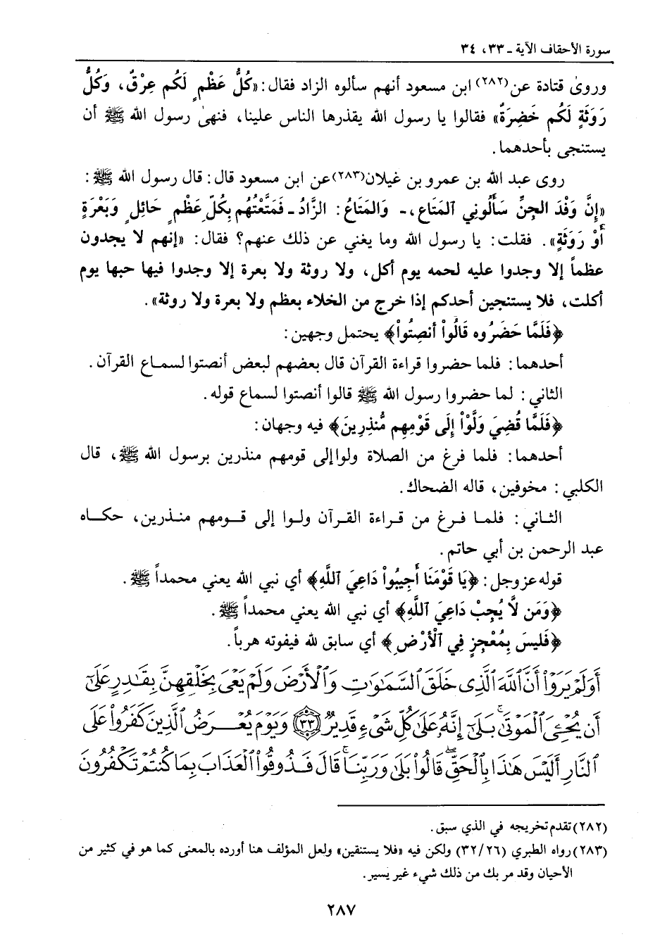 وروى قتادة عن ابن مسعود أنهم سألوه الزاد فقال: (كُلُّ عَظْمٍ لَكُم عِرْقٌ , وَكُلٌّ رَوَثَةٍ لَكُم خَضِرَةٌ) فقالوا يا رسول الله يقذرها الناس علينا , فنهى سول الله صلى الله عليه وسلم أن يستنجى بأحدهما. روى عبد الله بن عمرو بن غيلان عن ابن مسعود قال: قال رسول الله صلى الله عليه وسلم: (إِنَّ وَفْدَ الجِنَّ سَأَلُونِي المَتَاع , - وَالمَتَاعُ: الزَّادُ - فَمَتَّعْتُهُم بِكُلِّ عَظْمٍ حَائِلٍ وَبَعْرَةٍ أَوْ رَوَثَةٍ) فقلت: يا رسول الله وما يغني عن ذلك عنهم؟ فقال: (إنهم لا يجدون عظماً إلا وجدوا عليه لحمه يوم أكل , ولا روثة ولا بعرة إلا وجدوا فيها حبها يوم أكلت , فلا يستنجين أحدكم إذا خرج من الخلاء بعظم ولا بعرة ولا روثة). {فَلَمَّا حَضَرُوه قَالُواْ أنصِتُواْ} يحتمل وجهين: أحدهما: فلما حضروا قراءة القرآن قال بعضهم لبعض أنصتوا لسماع القرآن. الثاني: لما حضروا رسول الله صلى الله عليه وسلم قالوا أنصتوا لسماع قوله. {فَلَمَّا قُضِيَ وَلَّوْاْ إِلَى قَوْمِهِم مُّنذِرِينَ} فيه وجهان: أحدهما: فلما فرغ من الصلاة ولوا إلى قومهم منذرين برسول الله صلى الله عليه وسلم , قال الكلبي: مخوفين: قاله الضحاك. الثاني: فلما فرغ من قرءاة القرآن ولوا إلى قومهم منذرين , حكاه عبد الرحمن بن أبي حاتم. قوله عز وجل: {يَا قَوْمَنَا أَجِيبُواْ دَاعِيَ اللَّهِ} أي نبي الله يعني محمداً صلى الله عليه وسلم. {وَمَن لاَّ يُجِبْ دَاعِيَ اللَّهِ} أي نبي الله يعني محمداً صلى الله عليه وسلم. {فَليسَ بِمُعْجِزٍ فِي الأَرْضِ} أي سابق لله فيفوته هرباً.