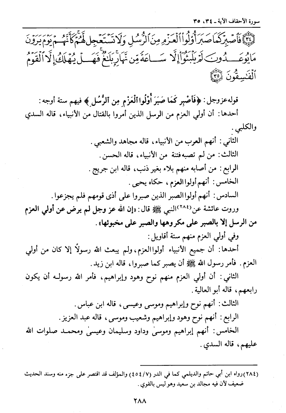 فاصبر كما صبر أولوا العزم من الرسل ولا تستعجل لهم كأنهم يوم يرون ما يوعدون لم يلبثوا إلا ساعة من نهار بلاغ فهل يهلك إلا القوم الفاسقون} قوله عز وجل: {فَاصْبِر كَمَا صَبَرَ أُوْلُوا الْعَزْمِ مِن الرُّسُلِ} فيهم ستة أوجه: أحدها: أن أولي العزم من الرسل الذين أمروا بالقتال من الأنبياء , قاله السدي والكلبي. الثاني: أنهم العرب من الأنبياء , قاله مجاهد والشعبي. الثالث: من لم تصبه فتنة من الأنبياء , قاله الحسن. الرابع: من أصابه منهم بلاء بغير ذنب , قاله ابن جريج. الخامس: أنهم أولوا العزم , حكاه يحيى. السادس: أنهم أولوا الصبر الذين صبروا على أذى قومهم فلم يجزعوا. وروت عائشة عن النبي صلى الله عليه وسلم قال: (إن الله عز وجل لم يرض عن أولي العزم من الرسل إلا بالصبر على مكروهها والصبر على مخبوئها). وفي أولي العزم منهم ستة أقاويل: أحدها: أن جميع الأنبياء أولوا العزم , ولم يبعث الله رسولاً إلا كان من أولي العزم. فأمر رسول الله صلى الله عليه وسلم أن يصبر كما صبروا , قاله ابن زيد. الثاني: أن أولي العزم منهم نوح وهود وإبراهيم , فأمر الله رسوله أن يكون رابعهم , قاله أبو العالية. الثالث: أنهم نوح وإبراهيم وموسى وعيسى , قاله ابن عباس. الرابع: أنهم نوح وهود وإبراهيم وشعيب وموسى , قاله عبد العزيز. الخامس: أنهم إبراهيم وموسى وداود وسليمان وعيسى ومحمد صلوات الله عليهم , قاله السدي.