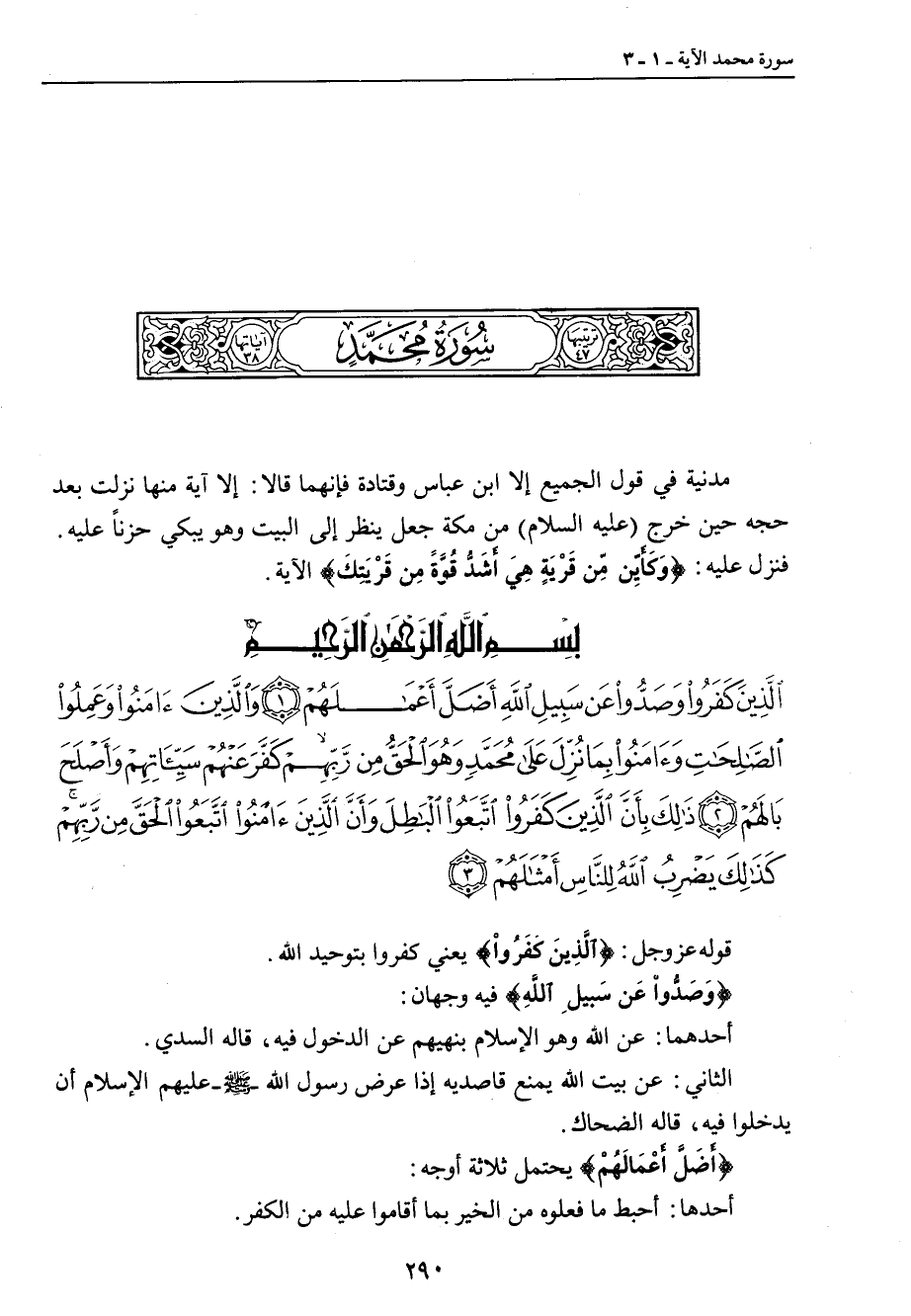 {الذين كفروا وصدوا عن سبيل الله أضل أعمالهم والذين آمنوا وعملوا الصالحات وآمنوا بما نزل على محمد وهو الحق من ربهم كفر عنهم سيئاتهم وأصلح بالهم ذلك بأن الذين كفروا اتبعوا الباطل وأن الذين آمنوا اتبعوا الحق من ربهم كذلك يضرب الله للناس أمثالهم} قوله عز وجل: {الَّذِينَ كَفَرُواْ} يعني كفروا بتوحيد الله. {وَصَدُّواْ عَن سَبيلِ اللَّهِ} فيه وجهان: أحدهما: عن الله وهو الإسلام بنهيهم عن الدخول فيه , قاله السدي. الثاني: عن بيت الله يمنع قاصديه إذا عرض رسول الله صلى الله عليه وسلم - عليهم الإسلام أن يدخلوا فيه , قاله الضحاك. {أَضَلَّ أَعْمَالَهُمْ} يحتمل ثلاثة أوجه: أحدها: أحبط ما فعلوه من الخير بما أقاموا عليه من الكفر.