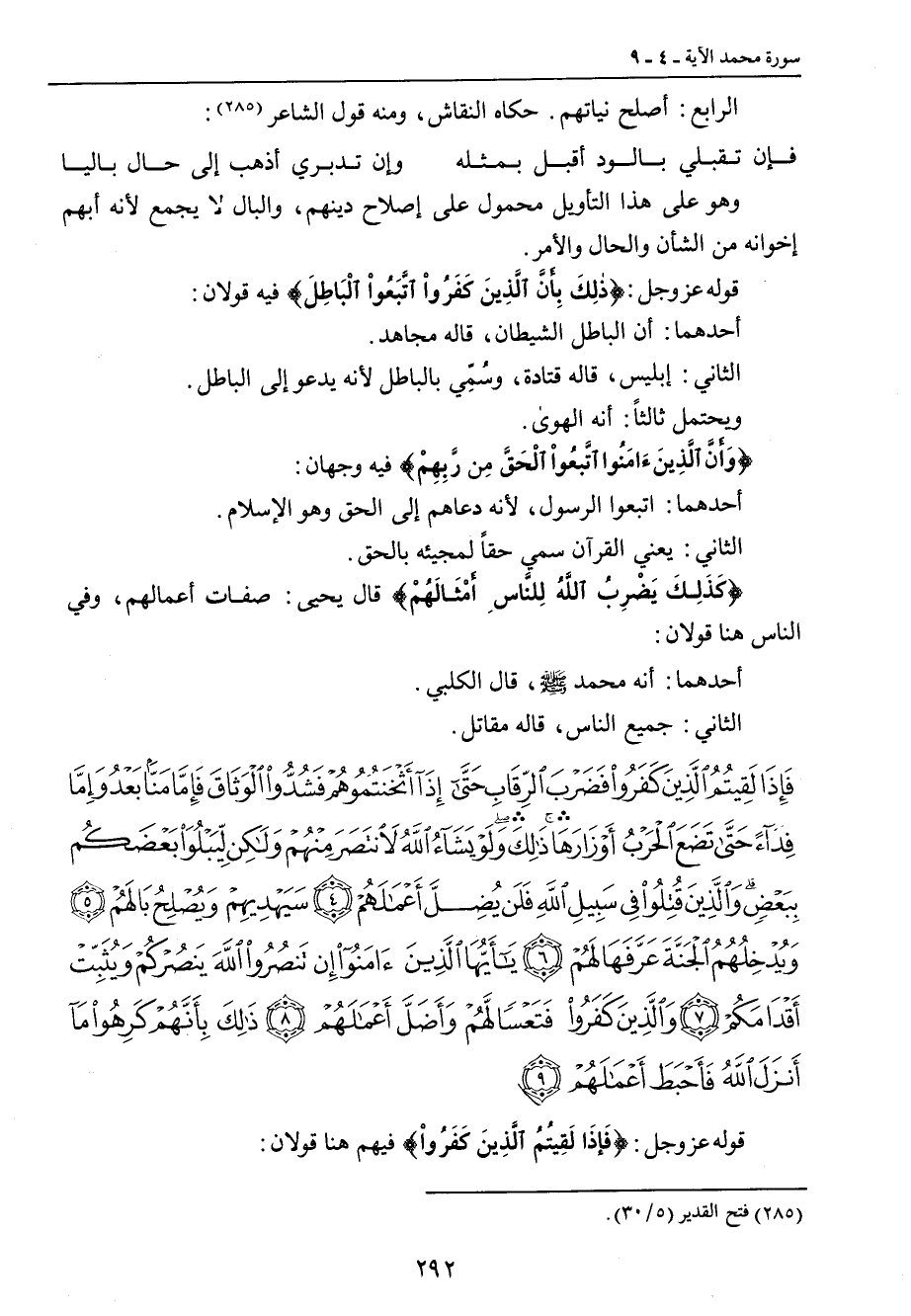 {فإذا لقيتم الذين كفروا فضرب الرقاب حتى إذا أثخنتموهم فشدوا الوثاق فإما منا بعد وإما فداء حتى تضع الحرب أوزارها ذلك ولو يشاء الله لانتصر منهم ولكن ليبلو بعضكم ببعض والذين قتلوا في سبيل الله فلن يضل أعمالهم سيهديهم ويصلح بالهم ويدخلهم الجنة عرفها لهم يا أيها الذين آمنوا إن تنصروا الله ينصركم ويثبت أقدامكم والذين كفروا فتعسا لهم وأضل أعمالهم ذلك بأنهم كرهوا ما أنزل الله فأحبط أعمالهم} قوله عز وجل: {فَإذَا لَقِيتُمُ الَّذِينَ كَفَرُواْ} فيهم هنا قولان: