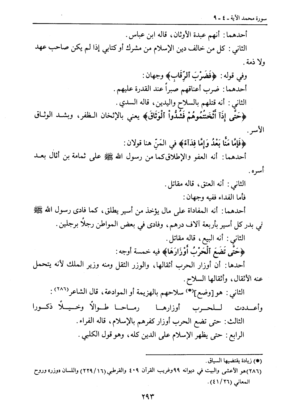 أحدهما: أنهم عبدة الأوثان , قاله ابن عباس. الثاني: كل من خالف دين الإسلام من مشرك أو كتابي إذا لم يكن صاحب عهد ولا ذمة. وفي قوله: {فَضَرْبَ الرِّقَابِ} وجهان: أحدهما: ضرب أعناقهم صبراً عند القدرة عليهم. الثاني: أنه قتلهم بالسلاح واليدين , قاله السدي. {حَتَّى إِذَآ أَثخَنُتُموهُمْ فَشُدُّواْ الْوَثَاقَ} يعني بالإثخان الظفر , وبشد الوثاق الأسر. {فَإِمَّا مَنّاً بَعْدُ وَإِمَّا فِدَآءً} في المَنِّ هنا قولان: أحدهما: أنه العفو والإطلاق كما من رسول الله صلى الله عليه على ثمامة بن أثال بعد أسره. الثاني: أنه العتق , قاله مقاتل. فأما الفداء ففيه وجهان: أحدهما: أنه المفاداة على مال يؤخذ من أسير يطلق , كما فادى رسول الله صلى الله عليه وسلم في بدر كل أسير بأربعة آلاف درهم , وفادى في بعض المواطن رجلاً برجلين. الثاني: أنه البيع , قاله مقاتل. {حَتَّى تَضَعَ الْحَرْبُ أَوْزَارَهَا} فيه خمسة أوجه: أحدها: أن أوزار الحرب أثقالها , والوزر الثقل ومنه وزير الملك لأنه يتحمل عنه الأثقال , وأثقالها السلاح. الثاني: هو [وضع] سلاحهم بالهزيمة أو الموادعة , قال الشاعر: