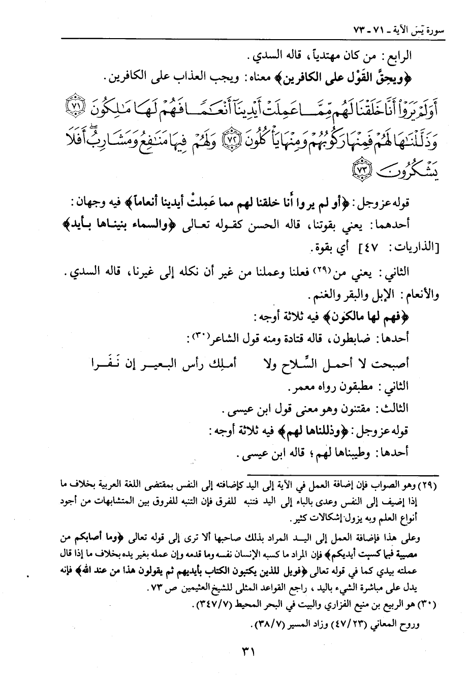{أو لم يروا أنا خلقنا لهم مما عملت أيدينا أنعاما فهم لها مالكون وذللناها لهم فمنها ركوبهم ومنها يأكلون ولهم فيها منافع ومشارب أفلا يشكرون} قوله عز جل: {أو لم يروا أَنا خلقنا لهم مما عَمِلتْ أيدينا أنعاماً} فيه وجهان: أحدهما يعني بقوتنا: قاله الحسن كقوله تعالى {والسماء بنيناها بأيد} [الذاريات: 47] أي بقوة. الثاني: يعني من فعلنا وعملنا من غير أن نكله إلى غيرنا , قاله السدي. والأنعام: الإبل والبقر والغنم. {فهم لها مالكون} فيه ثلاثة أوجه: أحدها: ضابطون , قاله قتادة , ومنه قول الشاعر: