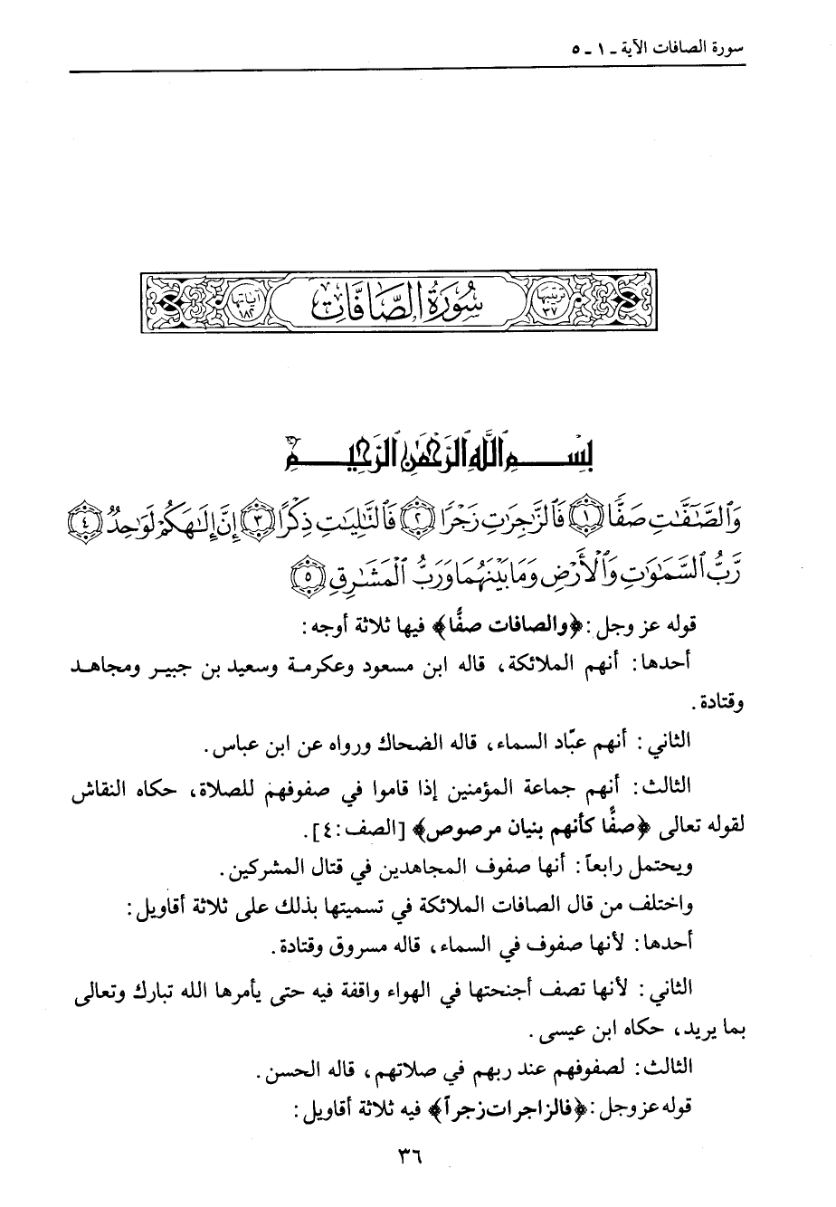 {والصافات صفا فالزاجرات زجرا فالتاليات ذكرا إن إلهكم لواحد رب السماوات والأرض وما بينهما ورب المشارق} قوله عز وجل: {والصافات صفّاً} فيها ثلاثة أوجه: أحدها: أنهم الملائكة , قاله ابن مسعود وعكرمة وسعيد بن جبير ومجاهد وقتادة. الثاني: أنهم عبّاد السماء , قاله الضحاك ورواه عن ابن عباس. الثالث: أنهم جماعة المؤمنين إذا قاموا في صفوفهم للصلاة , حكاه النقاش لقوله تعالى {صفّاً كأنهم بنيان مرصوص} [الصف: 4]. ويحتمل رابعاً: أنها صفوف المجاهدين في قتال المشركين. واختلف من قال الصافات الملائكة في تسميتها بذلك على ثلاثة أقاويل: أحدها: لأنها صفوف في السماء , قاله مسروق وقتادة. الثاني: لأنها تصف أجنحتها في الهواء واقفة فيه حتى يأمرها الله تبارك وتعالى بما يريد , حكاه ابن عيسى. الثالث: لصفوفهم عند ربهم في صلاتهم , قاله الحسن. قوله عز وجل: {فالزاجرات زجراً} فيه ثلاثة أقاويل: