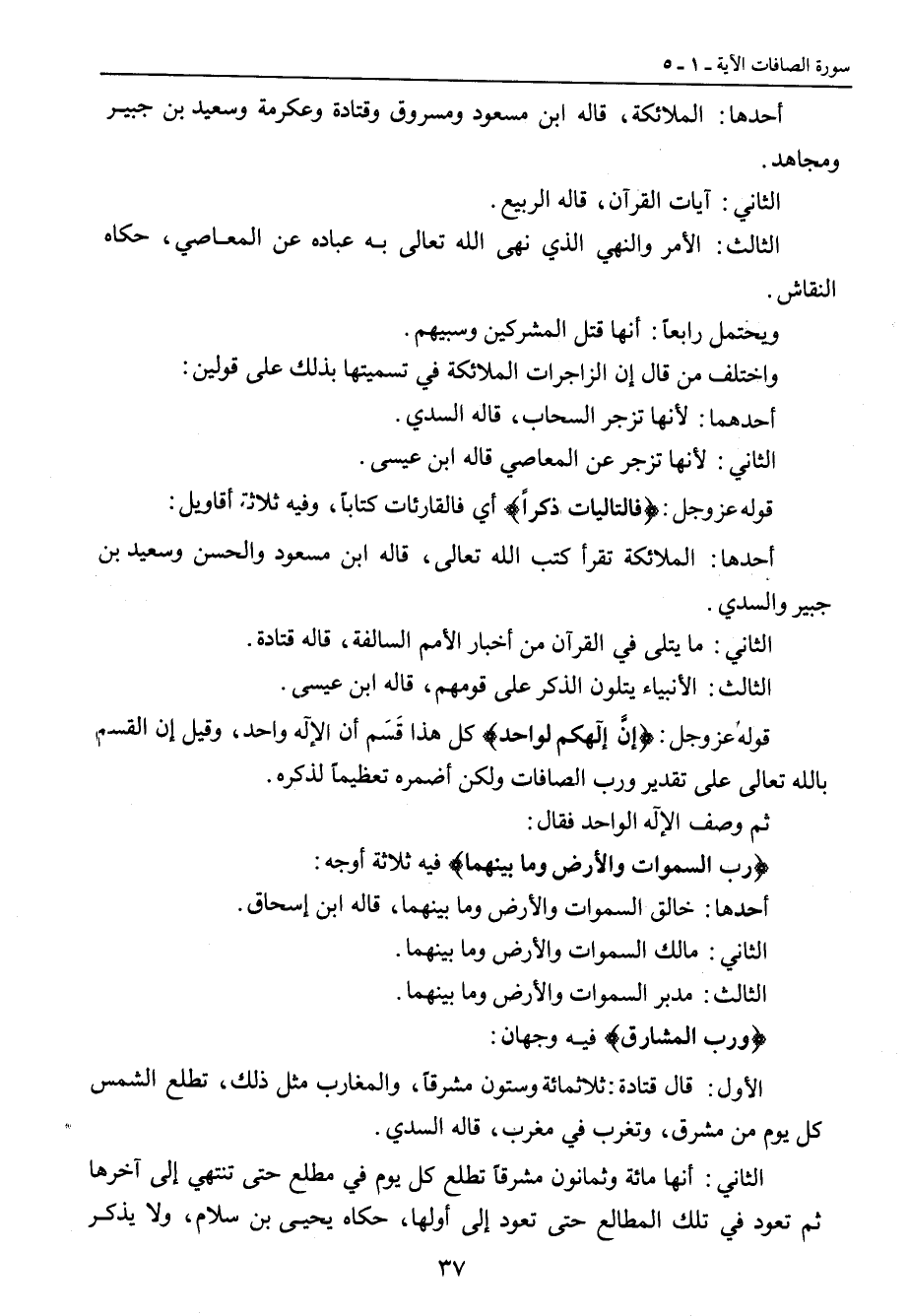 أحدها: الملائكة , قاله ابن مسعود ومسروق وقتادة وعكرمة وسعيد بن جبير ومجاهد. الثاني: آيات القرآن , قاله الربيع. الثالث: الأمر والنهي الذي نهى الله تعالى به عباده عن المعاصي , حكاه النقاش. ويحتمل رابعاً: أنها قتل المشركين وسبيهم. واختلف من قال إن الزاجرات الملائكة في تسميتها بذلك على قولين: أحدهما: لأنها تزجر السحاب , قاله السدي. الثاني: لأنها تزجر عن المعاصي قاله ابن عيسى. قوله عز وجل: {فالتاليات ذكراً} أي فالقارئات كتاباً , وفيه ثلاثة أقاويل: أحدها: الملائكة تقرأ كتب الله تعالى , قاله ابن مسعود والحسن وسعيد بن جبير والسدي. الثاني: ما يتلى في القرآن من أخبار الأمم السالفة , قاله قتادة. الثالث: الأنبياء يتلون الذكر على قومهم , قاله ابن عيسى. قوله عز وجل: {إنَّ إلهكم لواحد} كل هذا قَسَم أن الإِله واحد , وقيل إن القسم بالله تعالى على تقدير ورب الصافات ولكن أضمره تعظيماً لذكره. ثم وصف الإله الواحد فقال: {رب السموات والأرض وما بينهما} فيه ثلاثة أوجه: أحدها: خالق السموات والأرض وما بينهما , قاله ابن إسحاق. الثاني: مالك السموات والأرض وما بينهما. الثالث: مدبر السموات والأرض وما بينهما. {ورب المشارق} فيه وجهان: الأول: قال قتادة: ثلاثمائة وستون مشرقاً، والمغارب مثل ذلك، تطلع الشمس كل يوم من مشرق، وتغرب في مغرب، قاله السدي. الثاني: أنها مائة وثمانون مشرقاً تطلع كل يوم في مطلع حتى تنتهي إلى آخرها ثم تعود في تلك المطالع حتى تعود إلى أولها , حكاه يحيى بن سلام، ولا يذكر