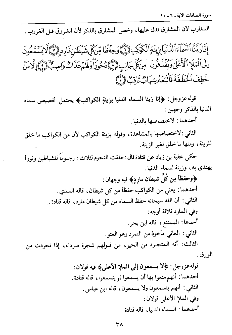 {إنا زينا السماء الدنيا بزينة الكواكب وحفظا من كل شيطان مارد لا يسمعون إلى الملإ الأعلى ويقذفون من كل جانب دحورا ولهم عذاب واصب إلا من خطف الخطفة فأتبعه شهاب ثاقب} قوله عز وجل: {إنا زينا السماء الدنيا بزينةٍ الكواكب} يحتمل تخصيص سماء الدنيا بالذكر وجهين: أحدهما: لاختصاصها بالدنيا. الثاني: لاختصاصها بالمشاهدة , وقوله بزينة الكواكب لأن من الكواكب ما خلق للزينة , ومنها ما خلق لغير الزينة. حكى عقبة بن زياد عن قتادة قال: خلقت النجوم لثلاث: رجوماً للشياطين ونوراً يهتدى به , وزينة لسماء الدنيا. {وحفظاً مِن كُلِّ شيطان مارِدٍ} فيه وجهان: أحدهما: يعني من الكواكب حفظاً من كل شيطان , قاله السدي. الثاني: أن الله سبحانه حفظ السماء من كل شيطان مارد، قاله قتادة. وفي المارد ثلاثة أوجه: أحدها: الممتنع، قاله ابن بحر. الثاني: العاتي مأخوذ من التمرد وهو العتو. الثالث: أنه المتجرد من الخير، من قولهم شجرة مرداء، إذا تجردت من الورق. قوله عز وجل: {لا يسمعون إلى الملإِ الأعلى} فيه قولان: أحدهما: أنهم منعوا بها أن يسمعوا أو يتسمعوا، قاله قتادة. الثاني: أنهم يتسمعون ولا يسمعون , قاله ابن عباس. وفي الملإ الأعلى قولان: أحدهما: السماء الدنيا، قاله قتادة.