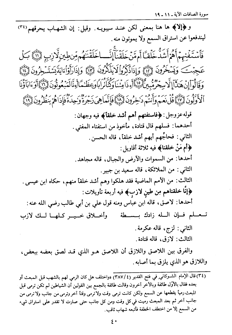 {فاستفتهم أهم أشد خلقا أم من خلقنا إنا خلقناهم من طين لازب بل عجبت ويسخرون وإذا ذكروا لا يذكرون وإذا رأوا آية يستسخرون وقالوا إن هذا إلا سحر مبين أئذا متنا وكنا ترابا وعظاما أئنا لمبعوثون أو آباؤنا الأولون قل نعم وأنتم داخرون فإنما هي زجرة واحدة فإذا هم ينظرون} قوله عز وجل: {فاستفتهم أهم أشد خلقاً} فيه وجهان: أحدهما: فسلهم قال قتادة , مأخوذ من استفتاء المفتي. الثاني: فحاجِّهم أيهم أشد خلقاً , قاله الحسن. {أم مَنْ خلقنا} فيه ثلاثة أقاويل: أحدها: من السموات والأرض والجبال , قاله مجاهد. الثاني: من الملائكة , قاله سعيد بن جبير. الثالث: من الأمم الماضية فقد هلكوا وهم أشد خلقاً منهم , حكاه ابن عيسى. {إنَّاخلقناهم مِن طينٍ لازبٍ} فيه أربعة تأويلات: أحدها: لاصق، قاله ابن عباس منه قول علي بن أبي طالب رضي الله عنه:
