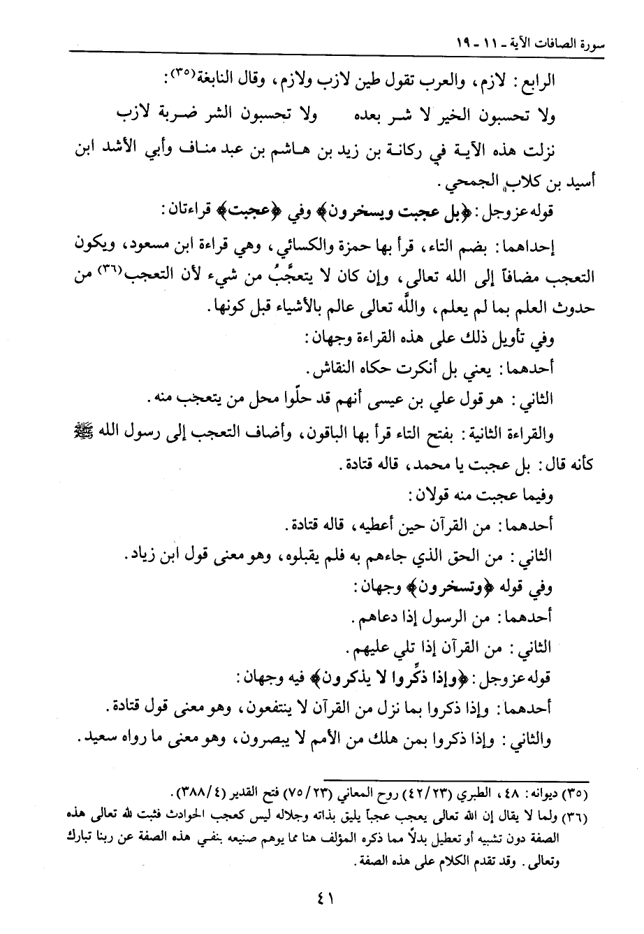 نزلت هذه الآية في ركانة بن زيد بن هاشم بن عبد مناف وأبي الأشد ابن أسيد بن كلاب الجمحي. قوله عز وجل: {بل عجبت ويسخرون} وفي {عجبت} قراءتان: إحداهما: بضم التاء , قرأ بها حمزة والكسائي , وهي قراءة ابن مسعود , ويكون التعجب مضافاً إلى الله تعالى , وإن كان لا يتعجَّبُ من شيء لأن التعجب من حدوث العلم بما لم يعلم , واللَّه تعالى عالم بالأشياء قبل كونها. وفي تأويل ذلك على هذه القراءة وجهان: أحدهما: يعني بل أنكرت حكاه النقاش. الثاني: هو قول علي بن عيسى أنهم قد حلّوا محل من يتعجب منه. والقراءة الثانية: بفتح التاء قرأ بها الباقون , وأضاف التعجب إلى رسول الله صلى الله عليه وسلم كأنه قال: بل عجبت يا محمد , قاله قتادة. وفيما عجبت منه قولان: أحدهما: من القرآن حين أعطيه، قاله قتادة. الثاني: من الحق الذي جاءهم به فلم يقبلوه، وهو معنى قول ابن زياد. وفي قوله {وتسخرون} وجهان: أحدهما: من الرسول إذا دعاهم. الثاني: من القرآن إذا تلي عليهم. قوله عز وجل: {وإذا ذكِّروا لا يذكرون} فيه وجهان: أحدهما: وإذا ذكروا بما نزل من القرآن لا ينتفعون، وهو معنى قول قتادة. والثاني: وإذا ذكروا بمن هلك من الأمم لا يبصرون، وهو معنى ما رواه سعيد.