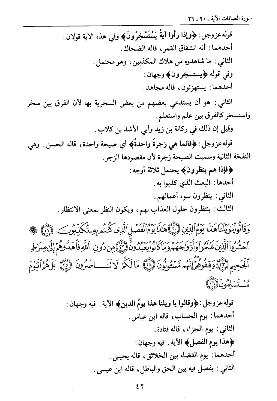 قوله عز وجل: {وإذا رأوا آيةً يَسْتَسْخِرُونَ} وفي هذه الآية قولان: أحدهما: أنه انشقاق القمر، قاله الضحاك. الثاني: ما شاهدوه من هلاك المكذبين , وهو محتمل. وفي قوله {يستسخِرون} وجهان: أحدهما: يستهزئون , قاله مجاهد. الثاني: هو أن يستدعي بعضهم من بعض السخرية بها لأن الفرق بين سخر واستسخر كالفرق بين علم واستعلم. وقيل إن ذلك في ركانة بن زيد وأبي الأشد بن كلاب. قوله عز وجل: {فانما هي زجرةٌ واحدةٌ} أي صيحة واحدة , قاله الحسن: وهي النفخة الثانية وسميت الصيحة زجرة لأن مقصودها الزجر. {فإذا هم ينظرون} يحتمل ثلاثة أوجه: أحدها: البعث الذي كذبوا به. الثاني: ينظرون سوء أعمالهم. الثالث: ينتظرون حلول العذاب بهم , ويكون النظر بمعنى الانتظار.