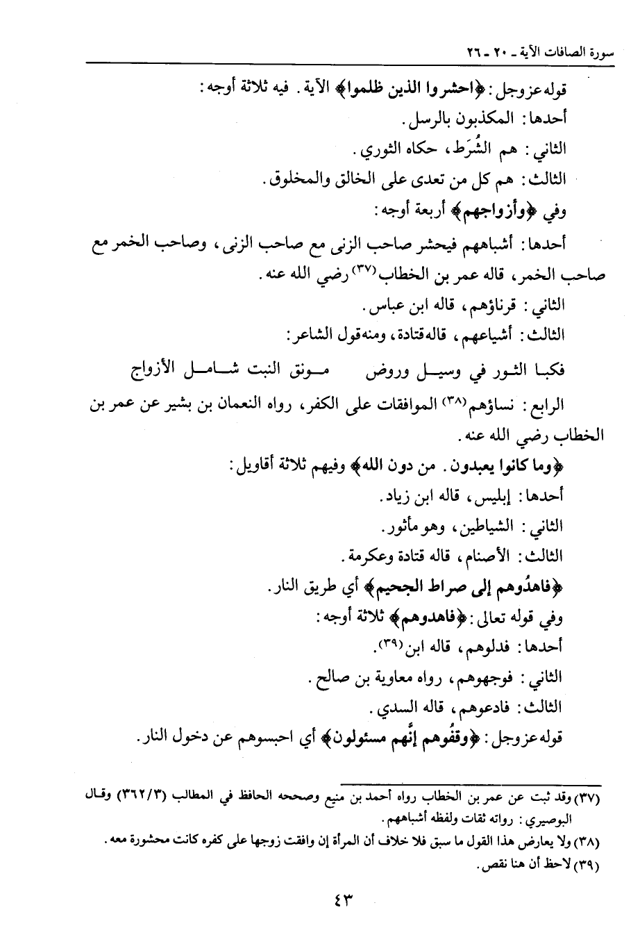 الرابع: نساؤهم الموافقات على الكفر , رواه النعمان بن بشير عن عمر بن الخطاب رضي الله عنه. {وما كانوا يعبدون من دون الله} وفيهم ثلاثة أقاويل: أحدها: إبليس , قاله ابن زياد. الثاني: الشياطين , وهو مأثور. الثالث: الأصنام , قاله قتادة وعكرمة. {فاهدُوهم إلى صراط الجحيم} أي طريق النار. وفي قوله تعالى: {فاهدوهم} ثلاثة أوجه: أحدها: فدلوهم , قاله ابن. الثاني: فوجهوهم , رواه معاوية بن صالح. الثالث: فادعوهم , قاله السدي. قوله عز وجل: {وقفُوهم إنَّهم مسئولون} أي احبسوهم عن دخول النار.