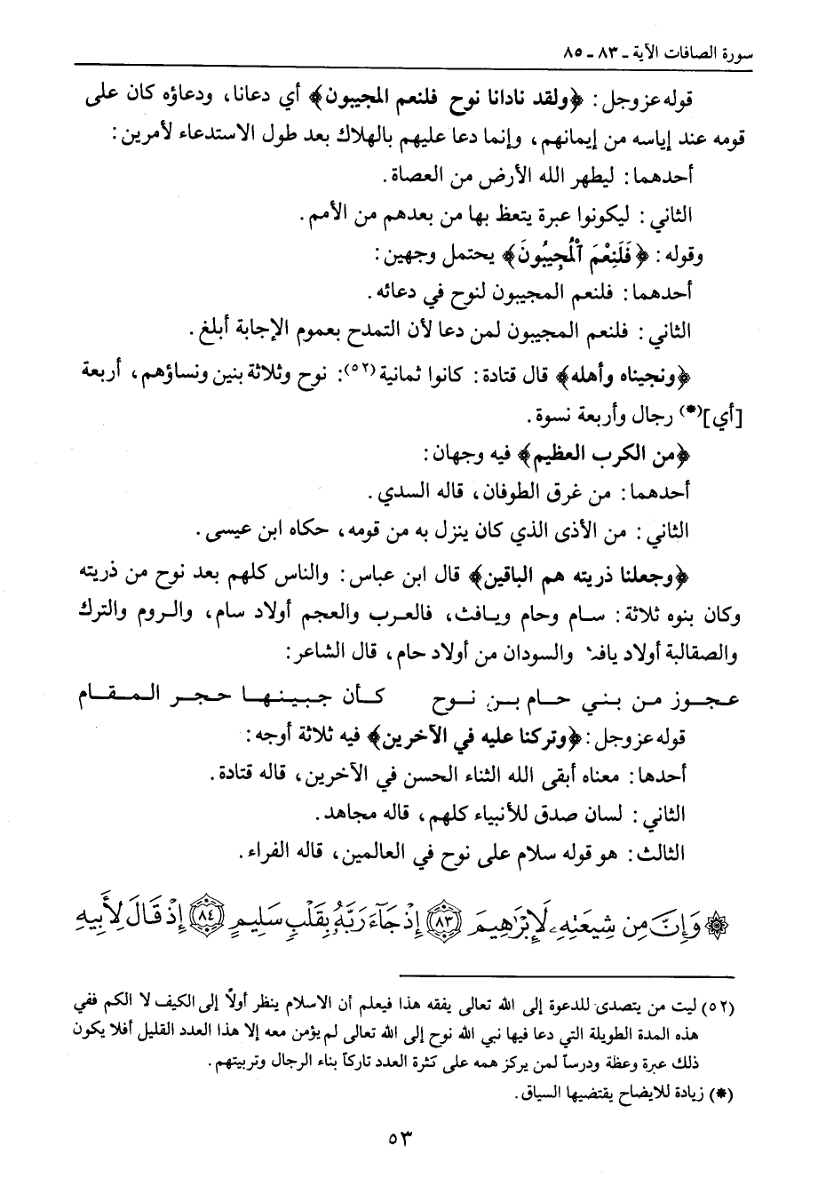 قوله عز وجل: {ولقد نادانا نوح فلنعم المجيبون} أي دعانا , ودعاؤه كان على قومه عند إياسه من إيمانهم , وإنما دعا عليهم بالهلاك بعد طول الاستدعاء لأمرين: أحدهما: ليطهر الله الأرض من العصاة. الثاني: ليكونوا عبرة يتعظ بها من بعدهم من الأمم. وقوله: {فَلَنِعْمَ الْمُجِيبُونَ} يحتمل وجهين: أحدهما: فلنعم المجيبون لنوح في دعائه. الثاني: فلنعم المجيبون لمن دعا لأن التمدح بعموم الإجابة أبلغ. {ونجيناه وأهله} قال قتادة: كانوا ثمانية: نوح وثلاثة بنين ونساؤهم , أربعة [أي] رجال وأربعة نسوة. {من الكرب العظيم} فيه وجهان: أحدهما: من غرق الطوفان , قاله السدي. الثاني: من الأذى الذي كان ينزل من قومه , حكاه ابن عيسى. {وجعلنا ذريته هم الباقين} قال ابن عباس: والناس كلهم بعد نوح من ذريته وكان بنوه ثلاثة: سام وحام ويافث , فالعرب والعجم أولاد سام , والروم والترك والصقالبة أولاد يافث والسودان من أولاد حام , قال الشاعر: