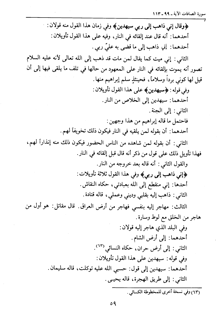 {وقال إني ذاهب إلى ربي سيهدين} وفي زمان هذا القول منه قولان: أحدهما: أنه قال عند إلقائه في النار، وفيه على هذا القول تأويلان: أحدهما: إني ذاهب إلى ما قضى به عليّ ربي. الثاني: إني ميت كما يقال لمن مات قد ذهب إلى الله تعالى لأنه عليه السلام تصور أنه يموت بإلقائه في النار على المعهود من حالها في تلف ما يلقى فيها إلى أن قيل لها كوني برداً وسلاماً , فحينئذٍ سلم إبراهيم منها. وفي قوله: {سيهدين} على هذا القول تأويلان: أحدهما: سيهدين إلى الخلاص من النار. الثاني: إلى الجنة. فاحتمل ما قاله إبراهيم من هذا وجهين: أحدهما: أن بقوله لمن يلقيه في النار فيكون ذلك تخويفاً لهم. الثاني: أن بقوله لمن شاهده من الناس الحضور فيكون ذلك منه إنذارً لهم , فهذا تأويل ذلك على قول من ذكر أنه قال قبل إلقائه في النار. والقول الثاني: أنه قاله بعد خروجه من النار. {إني ذاهب إلى ربي} وفي هذا القول ثلاثة تأويلات: أحدها: إني منقطع إلى الله بعبادتي , حكاه النقاش. الثاني: ذاهب إليه بقلبي وديني وعملي , قاله قتادة. الثالث: مهاجر إليه بنفسي فهاجر من أرض العراق. قال مقاتل: هو أول من هاجر من الخلق مع لوط وسارة. وفي البلد الذي هاجر إليه قولان: أحدهما: إلى أرض الشام. الثاني: إلى أرض حران، حكاه النسائي. وفي قوله: سيهدين على هذا القول تأويلان: أحدهما: سيهدين إلى قول: حسبي الله عليه توكلت، قاله سليمان. الثاني: إلى طريق الهجرة، قاله يحيى.