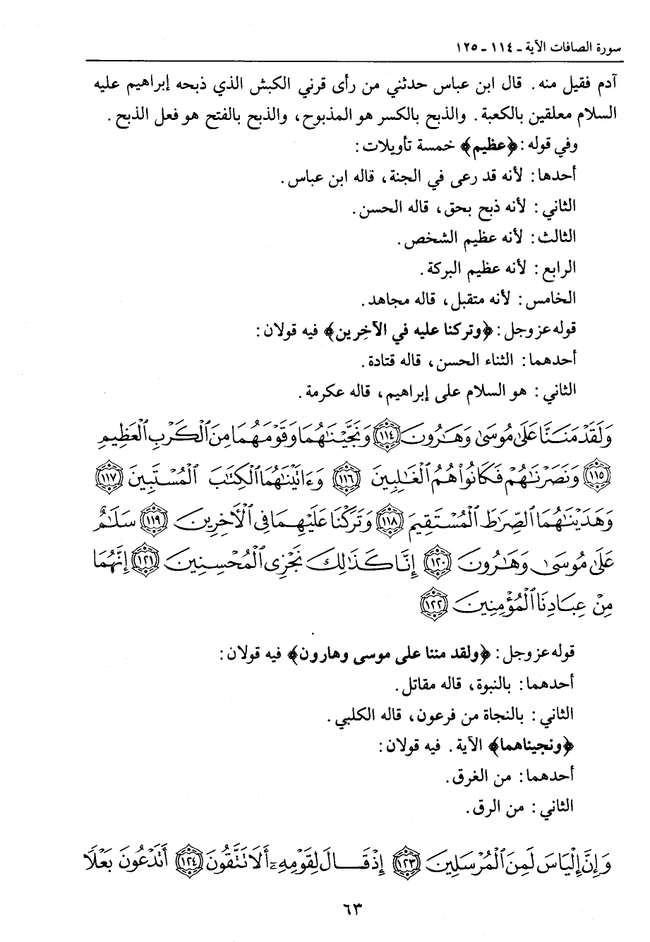 آدم فقيل منه. قال ابن عباس حدثني من رأى قرني الكبش الذي ذبحه إبراهيم عليه السلام معلقين بالكعبة. والذبح بالكسر هو المذبوح , والذبح بالفتح هو فعل الذبح. وفي قوله: {عظيم} خمسة تأويلات: أحدها: لأنه قد رعى في الجنة , قاله ابن عباس. الثاني: لأنه ذبح بحق , قاله الحسن. الثالث: لأنه عظيم الشخص. الرابع: لأنه عظيم البركة. الخامس: لأنه متقبل , قاله مجاهد. قوله عز وجل: {وتركنا عليه في الآخِرين} فيه قولان: أحدهما: الثناء الحسن , قاله قتادة. الثاني: هو السلام على إبراهيم , قاله عكرمة.
