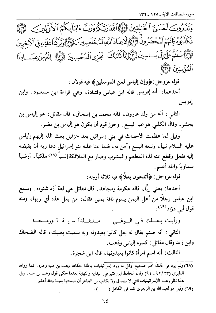 وتذرون أحسن الخالقين الله ربكم ورب آبائكم الأولين فكذبوه فإنهم لمحضرون إلا عباد الله المخلصين وتركنا عليه في الآخرين سلام على إل ياسين إنا كذلك نجزي المحسنين إنه من عبادنا المؤمنين} قوله عز وجل: {وإن إلياس لمن المرسلين} فيه قولان: أحدهما: أنه إدريس قاله ابن عباس وقتادة , وهي قراءة ابن مسعود: وابن إدريس. الثاني: أنه من ولد هارون , قاله محمد بن إسحاق , قال مقاتل: هو إلياس بن بحشر , وقال الكلبي هو عم اليسع. وجوز قوم أن يكون هو إلياس بن مضر. وقيل لما عظمت الأحداث في بني إسرائيل بعد حزقيل بعث الله إليهم إلياس عليه السلام نبياً , وتبعه اليسع وآمن به , فلما عتا عليه بنو إسرائيل دعا ربه أن يقبضه إليه ففعل وقطع عنه لذة المطعم والمشرب وصار مع الملائكة إنيساً ملكياً , أرضياً سماوياً , والله أعلم. قوله عز وجل: {أتدعون بعلاً} فيه ثلاثة أوجه: أحدها: يعني ربّاً , قاله عكرمة ومجاهد. قال مقاتل هي لغة أزد شنوءة، وسمع ابن عباس رجلاً من أهل اليمن يسوم ناقة بمنى فقال: من بعل هذه أي ربها، ومنه قول أبي دؤاد: