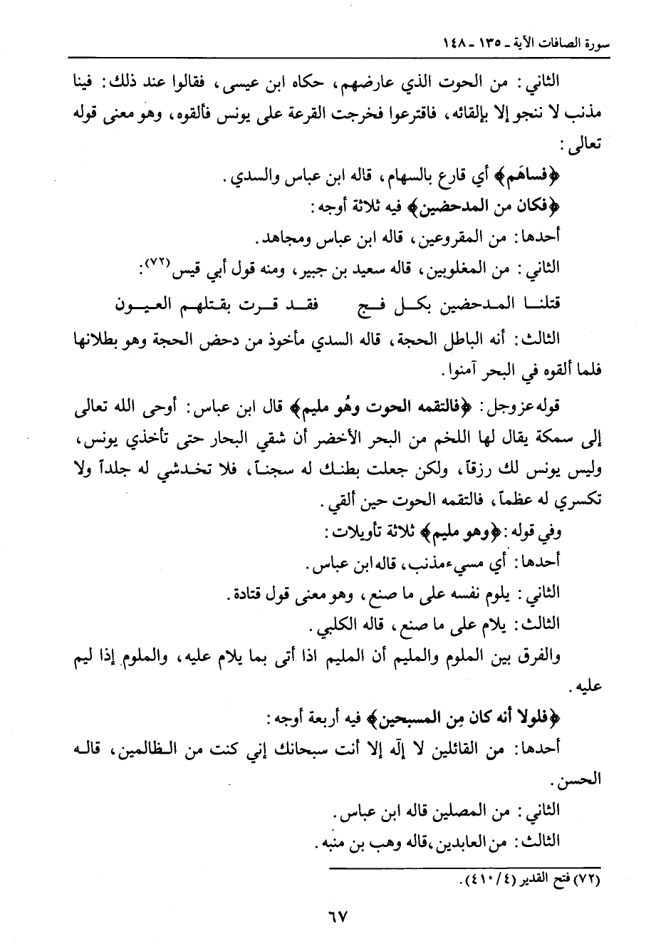 الثالث: أنه الباطل الحجة , قاله السدي مأخوذ من دحض الحجة وهو بطلانها فلما ألقوه في البحر آمنوا. قوله عز وجل: {فالتقمه الحوت وهُو مليم} قال ابن عباس: أوحى الله تعالى إلى سمكة يقال لها اللخم من البحر الأخضر أن شقي البحار حتى تأخذي يونس , وليس يونس لك رزقاً , ولكن جعلت بطنك له سجناً , فلا تخدشي له جلداً ولا تكسري له عظماً , فالتقمه الحوت حين ألقي. وفي قوله: {وهو مليم} ثلاثة تأويلات: أحدها: أي مسيء مذنب , قاله ابن عباس. الثاني: يلوم نفسه على ما صنع , وهو معنى قول قتادة. الثالث: يلام على ما صنع , قاله الكلبي. والفرق بين الملوم والمليم أن المليم اذا أتى بما يلام عليه , والملوم إذا ليم عليه. {فلولا أنه كان مِن المسبحين} فيه أربعة أوجه: أحدها: من القائلين لا إله إلا أنت سبحانك إني كنت من الظالمين , قاله الحسن. الثاني: من المصلين قاله ابن عباس. الثالث: من العابدين , قاله وهب بن منبه.