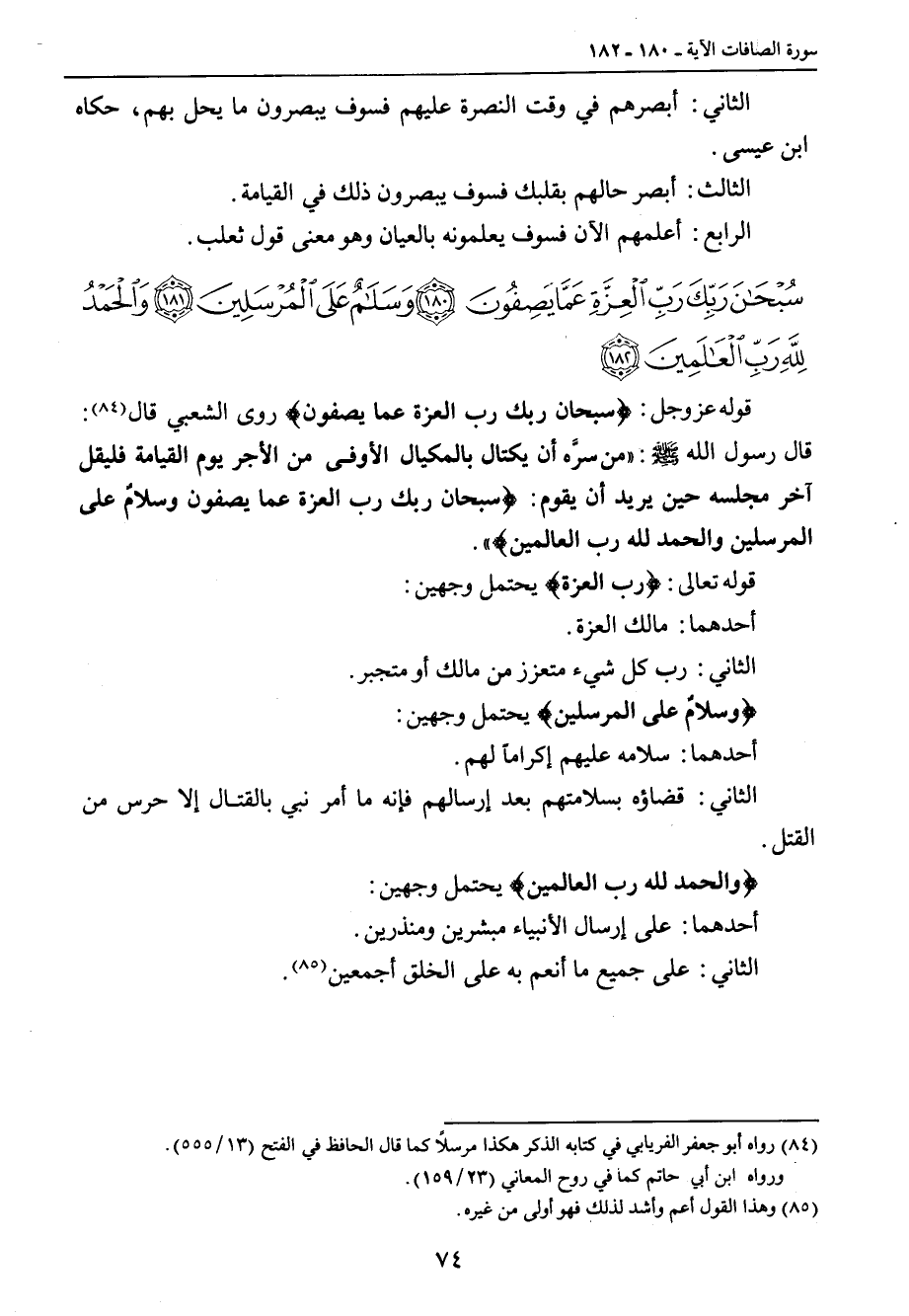{سبحان ربك رب العزة عما يصفون وسلام على المرسلين والحمد لله رب العالمين} قوله عز وجل: {سبحان ربك رب العزة عما يصفون} روى الشعبي قال: قال رسول الله صلى الله عليه وسلم: (من سرَّه أن يكتال بالمكيال الأوفى من الأجر يوم القيامة فليقل آخر مجلسه حين يريد أن يقوم: {سبحان ربك رب العزة عما يصفون وسلامٌ على المرسلين والحمد لله رب العالمين}). قوله تعالى: {رب العزة} يحتمل وجهين: أحدهما: مالك العزة. الثاني: رب كل شيء متعزز من مالك أو متجبر. {وسلامٌ على المرسلين} يحتمل وجهين: أحدهما: سلامه عليهم إكرماً لهم. الثاني: قضاؤه بسلامتهم بعد إرسالهم فإنه ما أمر نبي بالقتال إلا حرس من القتل. {والحمد لله رب العالمين} يحتمل وجهين: أحدهما: على إرسال الأنبياء مبشرين ومنذرين. الثاني: على جميع ما أنعم به على الخلق أجمعين.
